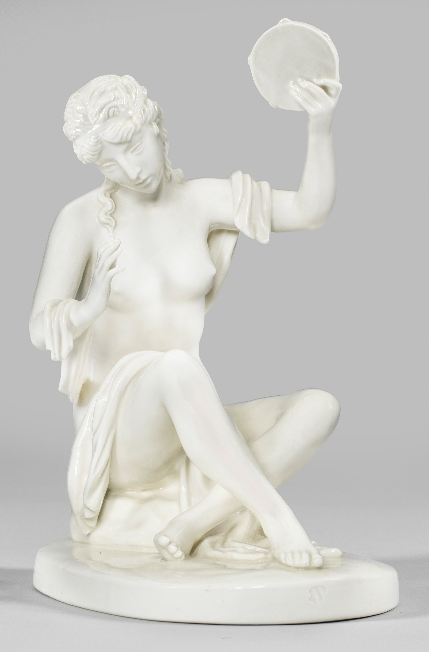 Altweißes Porzellan. Über ovaler Plinthe, auf einem Fels sitzender, weiblicher, antikisierender Halbakt beim Tamburinspiel. Entw. Roland von Bohr, 1939. Modell-Nr. 856 c. Produktionsmakel. Manufakturmarke. H. 25 cm.