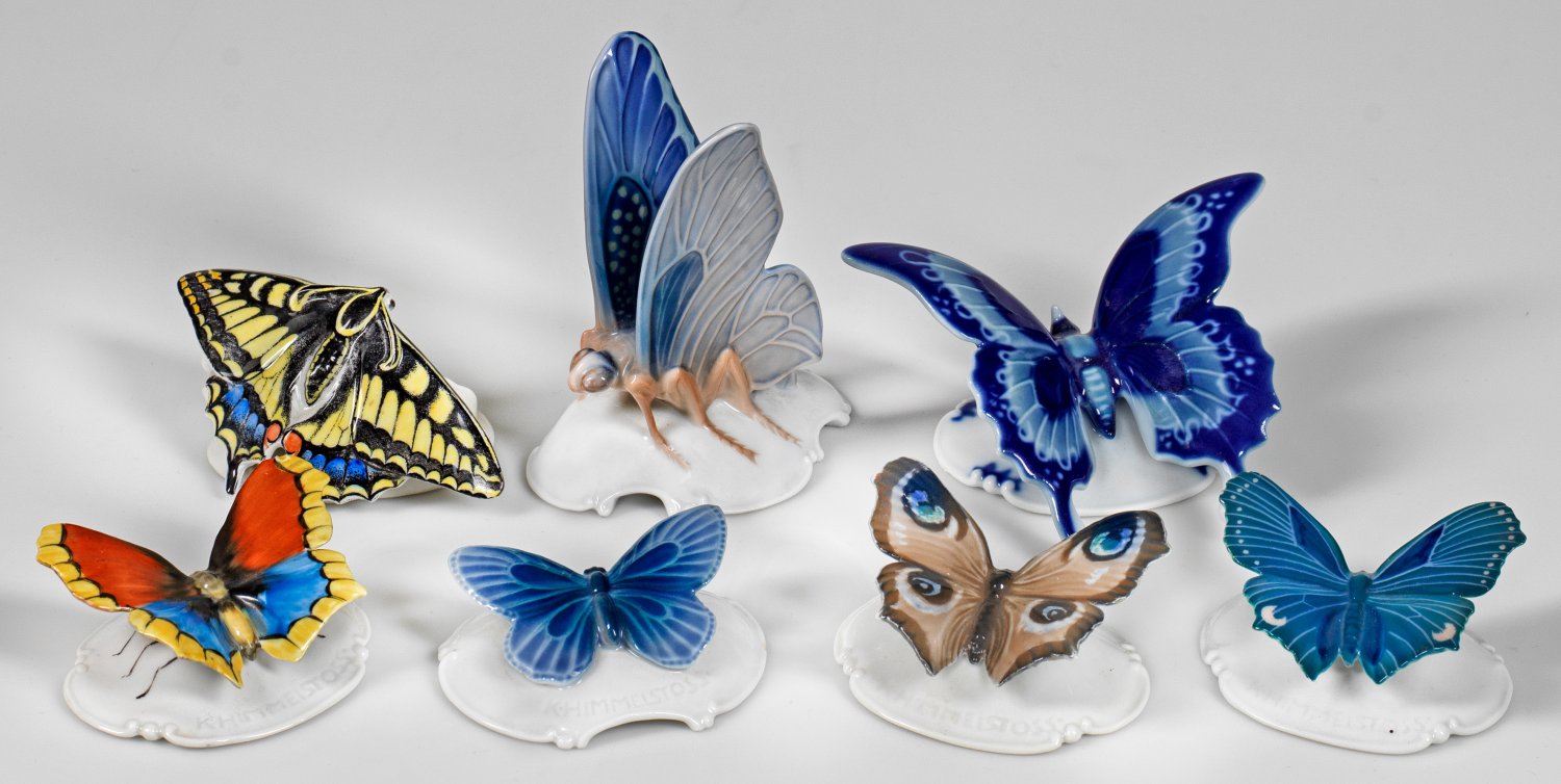 A collection of seven porcelain butterfly figures. Partly minor restored. Manufacturer's mark.
