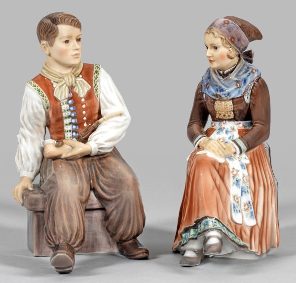 Sitzendes Mädchen mit übereinander geschlagenen Beinen bzw. Junge mit Tabakpfeife in traditioneller Amager-Tracht. Polychrome Unterglasurmalerei. Entw. Jens Peter Dahl Jensen. Modell-Nr. 1110 und 1300. Manufakturmarke. H. 24 cm.