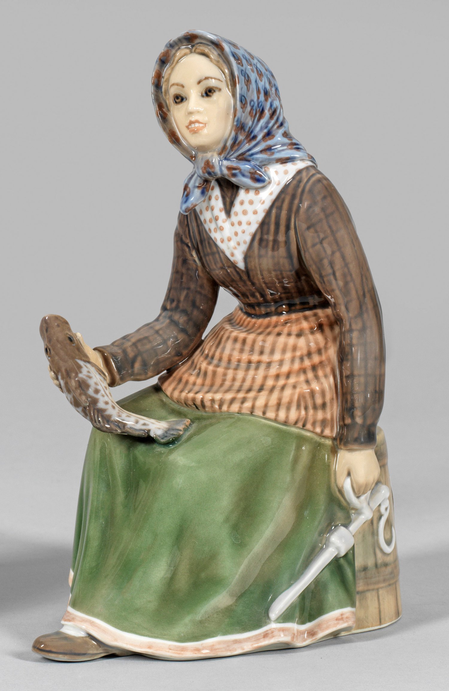 Sitzendes Fischermädchen in traditioneller Tracht, in der rechten Hand einen Fisch haltend. Polychrome Unterglasurmalerei. Modell-Nr. 1150. Manufakturmarke. H. 23 cm.