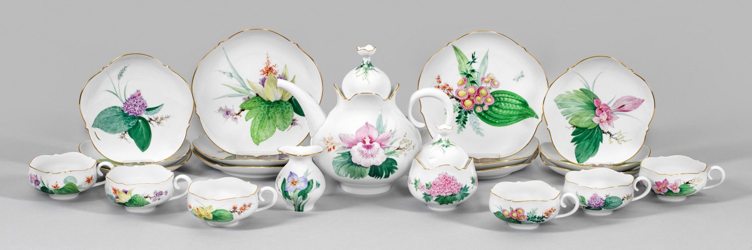 für sechs Personen. 15-tlg.; Teekanne, Sahnegießer, Zuckerdose, 6 Tassen mit Untertassen, 6 Konfektteller. Form "Großer Ausschnitt". Blütenförmig geschweifte Ränder. Auf der Wandung und im Spiegel großflächige Darstellung von verschiedenen, exotischen Pflanzen, u. a. der Miltonia-Orchidee, Wasserlilie, des Sumpfseidenkraut, Sonnen- und Nymphensterns sowie des Aronstabes in polychromer Aufglasurmalerei. Goldrand. Form-Entw. Ludwig Zepner, um 1972. Dekor-Entw. Horst Bretschneider (geb. 1952), Dekor-Nr. 500310. Jahreszeichen. Schwertermarke. Kannen-H. 20 cm. Tassen-H. 5 cm. Teller-D. 18,5 cm.