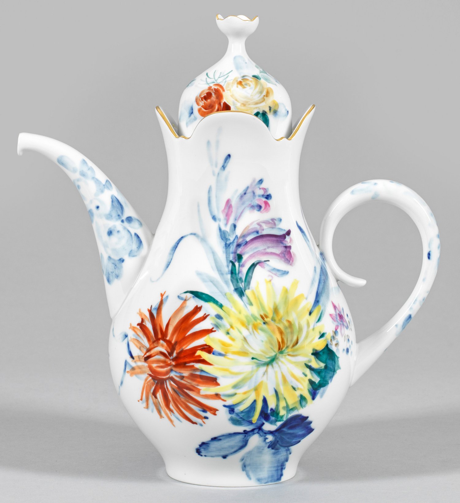 A porcelain coffee jug with underglaze-blue and polychrome painted decor "Blue-colourful flower". Date mark. Crossed swords mark.