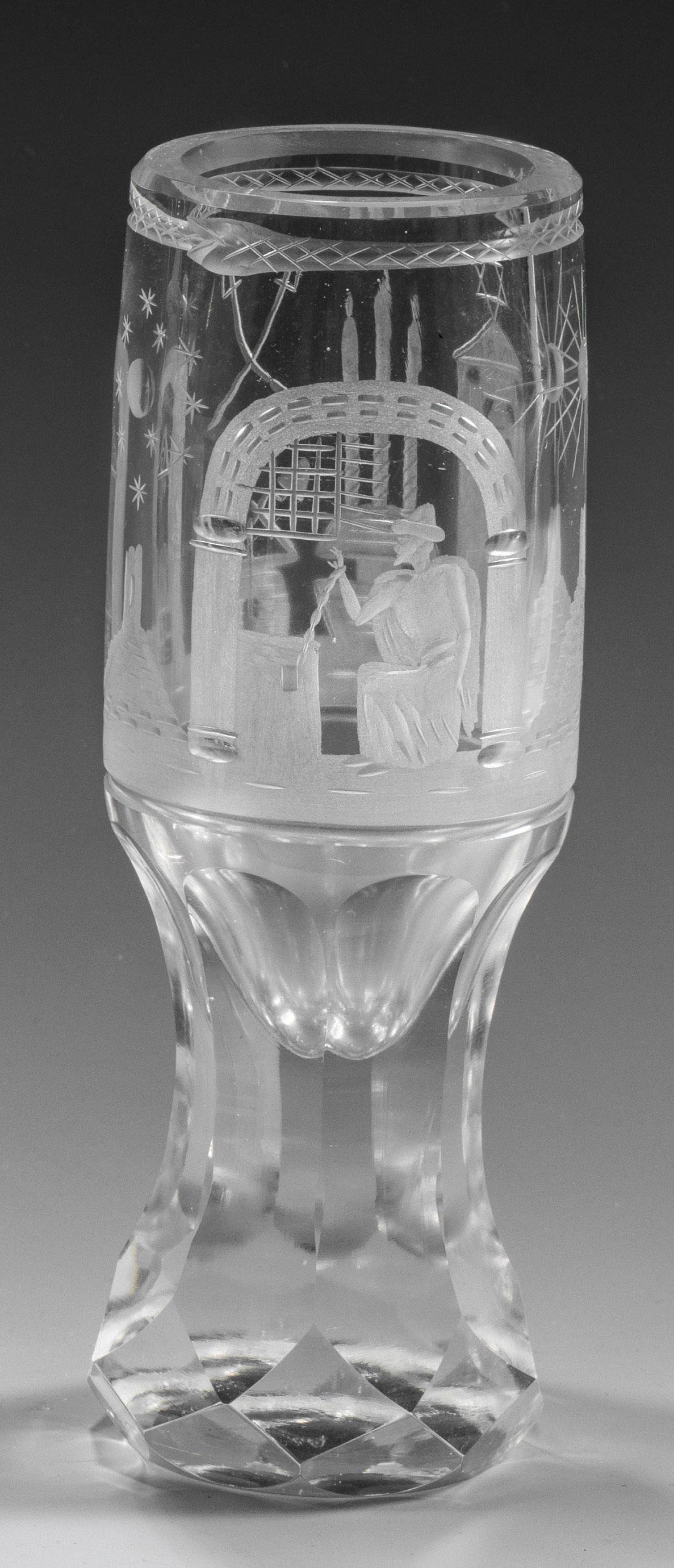 Sog. Kanone. Dickwandiges Bleikristallglas, geschliffen. Hoher, massiver Fuß wabenfacettiert und geschält; auf der zylindrischen Kuppa umlaufender, geschnittener Dekor aus unterschiedlichen Freimaurermotiven und -symbolen. H. 18,5 cm.