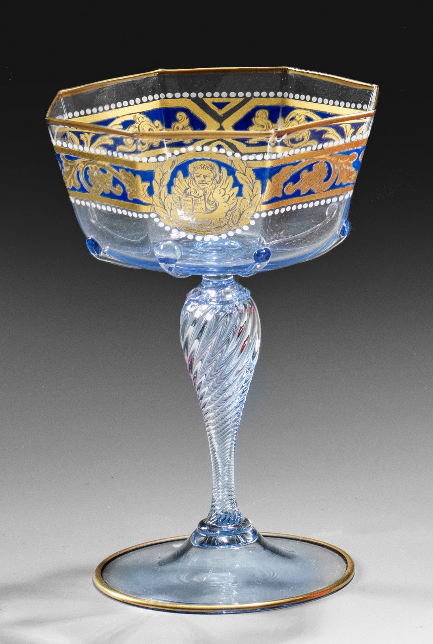 Hellblaues, transparentes Glas. Ansteigender Scheibenfuß mit umgeschlagenem Rand, schrägoptischer bzw. gerippter, hohler Keulenschaft, die weite, achteckige Kuppa mit acht korrespondierenden, einen Stern bildenden Fadenauflagen. Auf der Kuppa eine Bordüre mit Akanthusranken und dem Markuslöwen in blauer und weißer Emailmalerei und radiertem Gold. H. 14,8 cm.