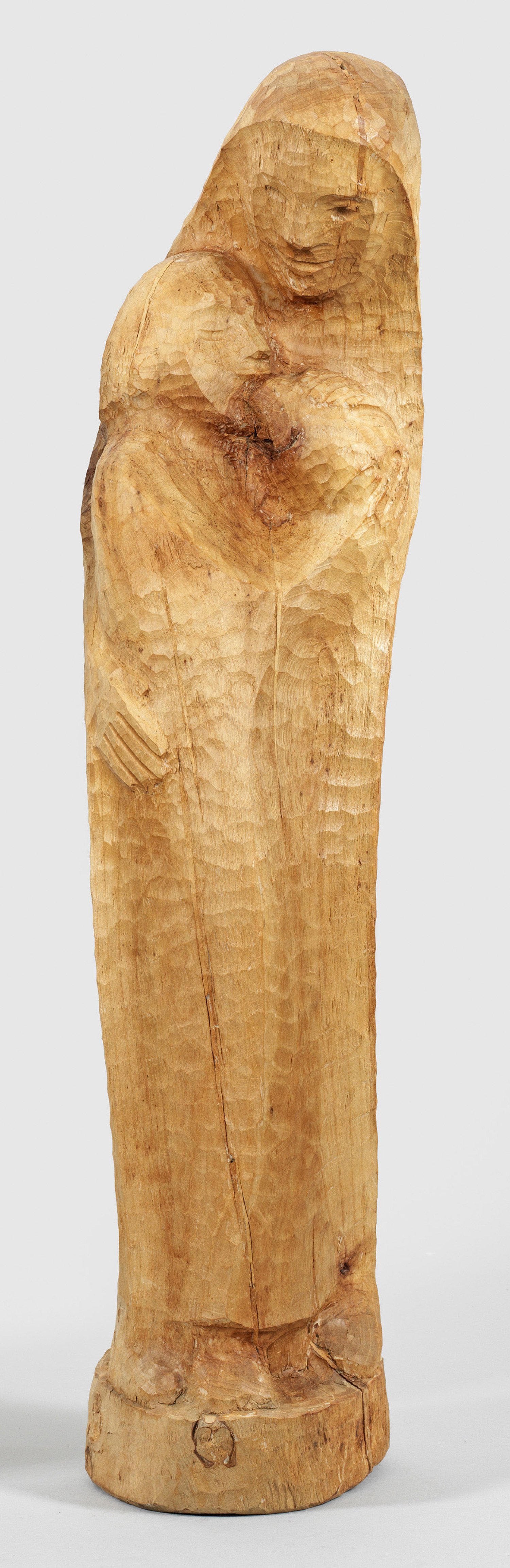 Lindenholz, geschnitzt mit sichtbar belassenen Bearbeitungsspuren. Sign.; Vollplastische, der Form des gebogten Stammes folgende, blockhaft stilisierte, expressionistische Gruppe, bei der eine stehende junge Frau einem dürstenden Jüngling (ihrem Sohn?) zu trinken gibt. Hierbei sind beide Figuren untrennbar miteinander verbunden. Dieses Werk spiegelt, wie ein Großteil seines Oeuvres, den prägenden Einfluss von Ernst Barlach auf Flath wider, den er selbst noch kennengelernt hatte. H. 84 cm.