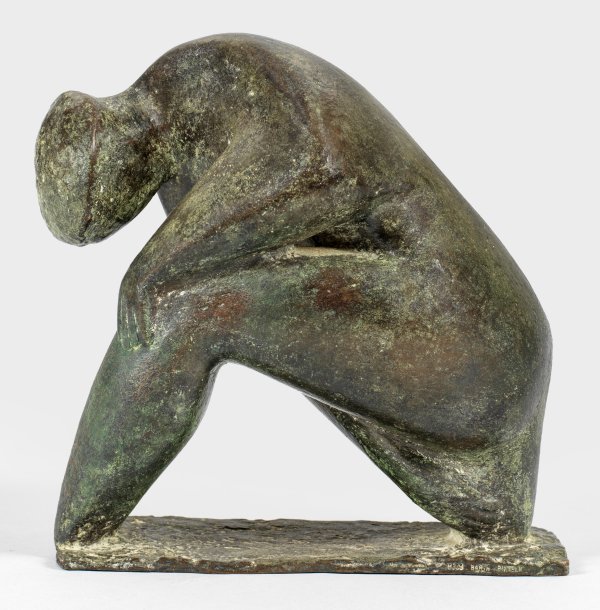 Bronze, patiniert, 1955. Monogr.; Gießerstempel "GUSS BARTH RINTELN". Guss nach 1970. Auflage wohl 3 Exemplare. Volumenhaft gestaltete, moderne Darstellung einer knienden Badenden. Im Entstehungsjahr 1955 nahm der Bildhauer an der documenta 1 in Kassel teil, ebenso wie der ihn offenbar stark beeinflussende Henry Moore. H. 18,5 cm.