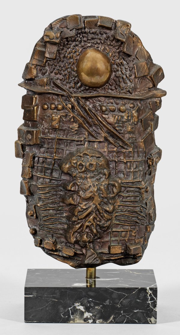 Bronze, dunkelbraun patiniert; Marmorsockel. Sign. u. nummeriert 96/99; Gießerstempel "VENTURI ARTE BOLOGNA" und Stempel "ARTES" des Herausgebers. Leicht konvex gewölbtes, hochovales Relief zwischen Figuration und Abstraktion, das in stark stilisierter Weise eine Eule unter einem Vollmond darstellt. Coignard war Keramiker, Bildhauer und Grafiker, der sich insbesondere mit der Carborundum-Technik befasste, beeinflusst von Henri Matisse, Georges Braque, Marc Chagall und der École de Paris. Ges.-H. 39,5 cm.