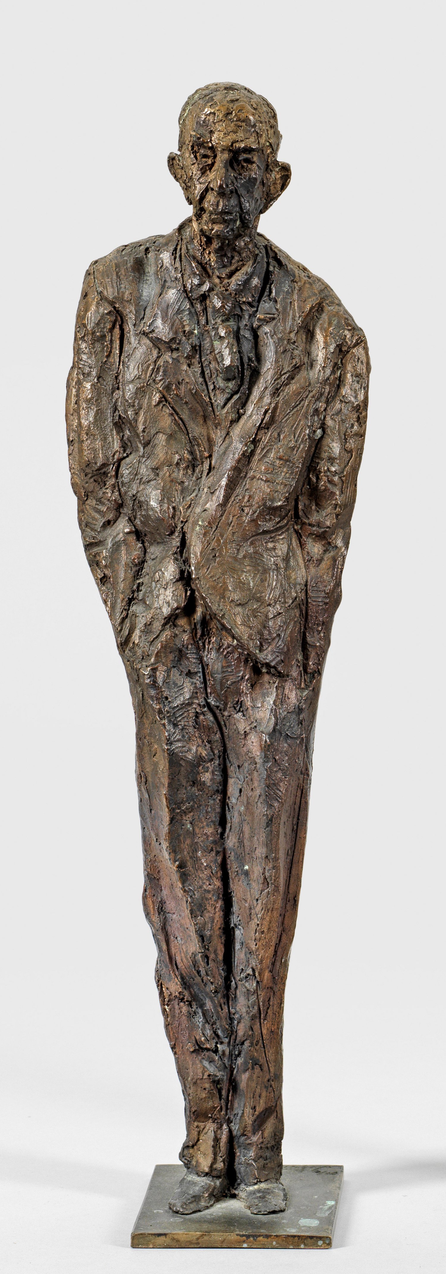 Bronze, dunkelbraun patiniert. Sign. u. dat. 1988, nummeriert 6/10. Die auf einer kleinen Plinthe stehende, hagere, überlängte Figur des Lyrikers wirkt vor allem durch ihren expressiv modellierten Kopf. Duttenhoefer wurde 1976 Mitglied der Neuen Darmstädter Sezession, seit 2003 lehrt er als Professor an der Hochschule Mannheim. H. 51,5 cm.