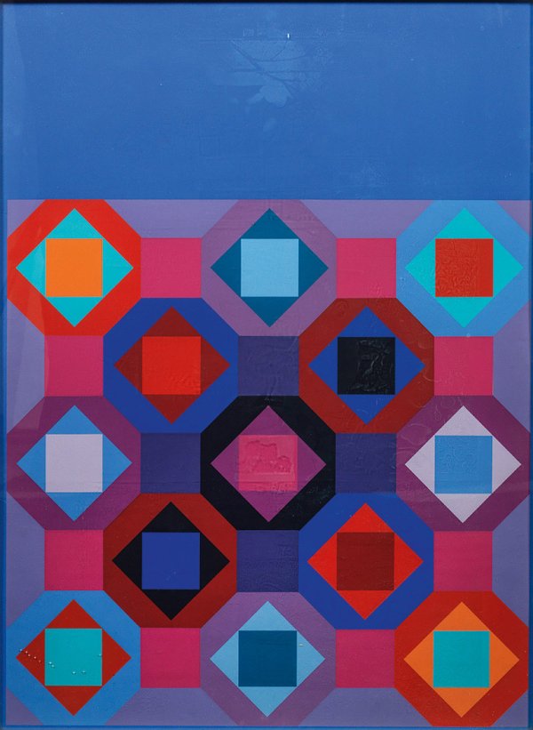 Farbserigraphie/leichter Karton, um 1975. Wohl erschienen bei Editions Lahumière. Verso Galerieetikett. Abstrakte Komposition des bedeutenden Op-Art Künstlers, der 1930 von Ungarn nach Paris ging und ab 1961 in Annet-sur-Marne lebte. Motiv 68,5 cm x 68,5 cm. Blatt 96,5 cm x 71,3 cm. Rahmen.