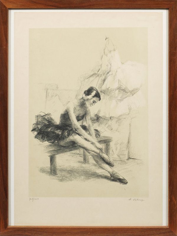 Lithographie/Papier. Sign. u. nummeriert 71/100. In Motiv und Stil typisches Blatt der tschechischen Künstlerin, die mit Vorliebe Ballettmotive schilderte. Darstellung 49,5 cm x 35,5 cm; Blatt 62,5 cm x 44 cm Rahmen.