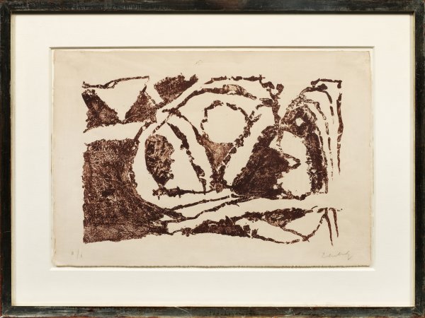 Lithographie/Arches-Velin (Wasserzeichen), 1960. Sign. und nummeriert III/X. Druck bei Jean Pons, Paris. Erschienen in: Christian Dotremont: La Reine des Murs. Galerie de France, Paris 1960. Verso Etikett der Galerie Roche, Bremen. Wvz. Rivière 109. Blatt 38 cm x 56,5 cm. Rahmen.