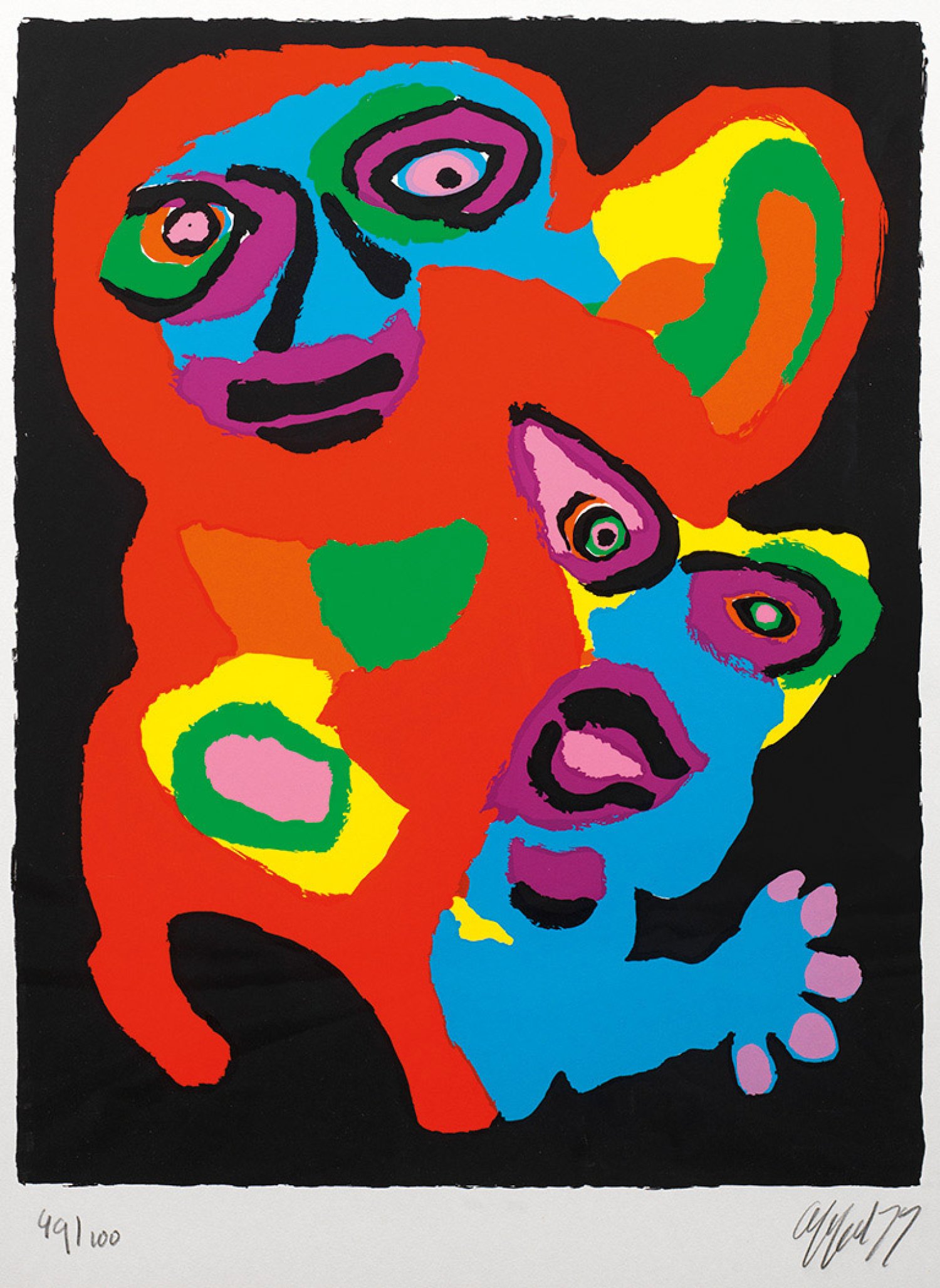 Farblithographie/Velin, 1977. Sign, dat. u. nummeriert 49/100. Appel, einer der bedeutendsten niederländischen Maler nach 1945, gründete 1948 mit Corneille und Constant, die er während des Studiums kennengelernt hatte, die "Nederlands Experimentele Groep" und im selben Jahr mit weiteren Künstlern die Künstlergruppe "CoBrA". Beeinflusst von Picasso, Matisse, Dubuffet, Art brut, Kinderbildern und dem Abstrakten Expressionismus fand er zu radikal expressiven, starkfarbigen, figurativen Darstellungen von teilw. aggressiv-brutalem oder kindlich-naivem Charakter. Darstellung ca. 67 cm x 52,5 cm. Rahmen.