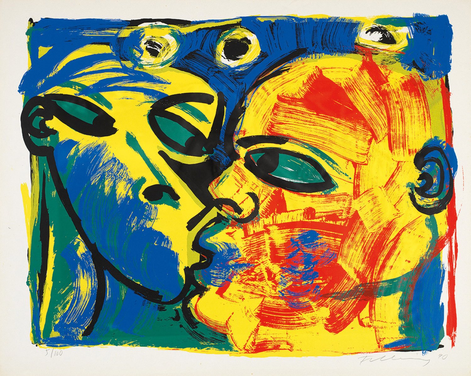 Farbserigraphie/glattes Velin, 1990. Sign., dat. und nummeriert 5/100. In Blau, Gelb und Rot komponierte, grell leuchtende Figurenkomposition Fettings, die der Künstler in insgesamt sieben, variierenden Farbausführungen geschaffen hat. Darstellung 67 cm x 88 cm. Blatt 75,4 cm x 95,5 cm.