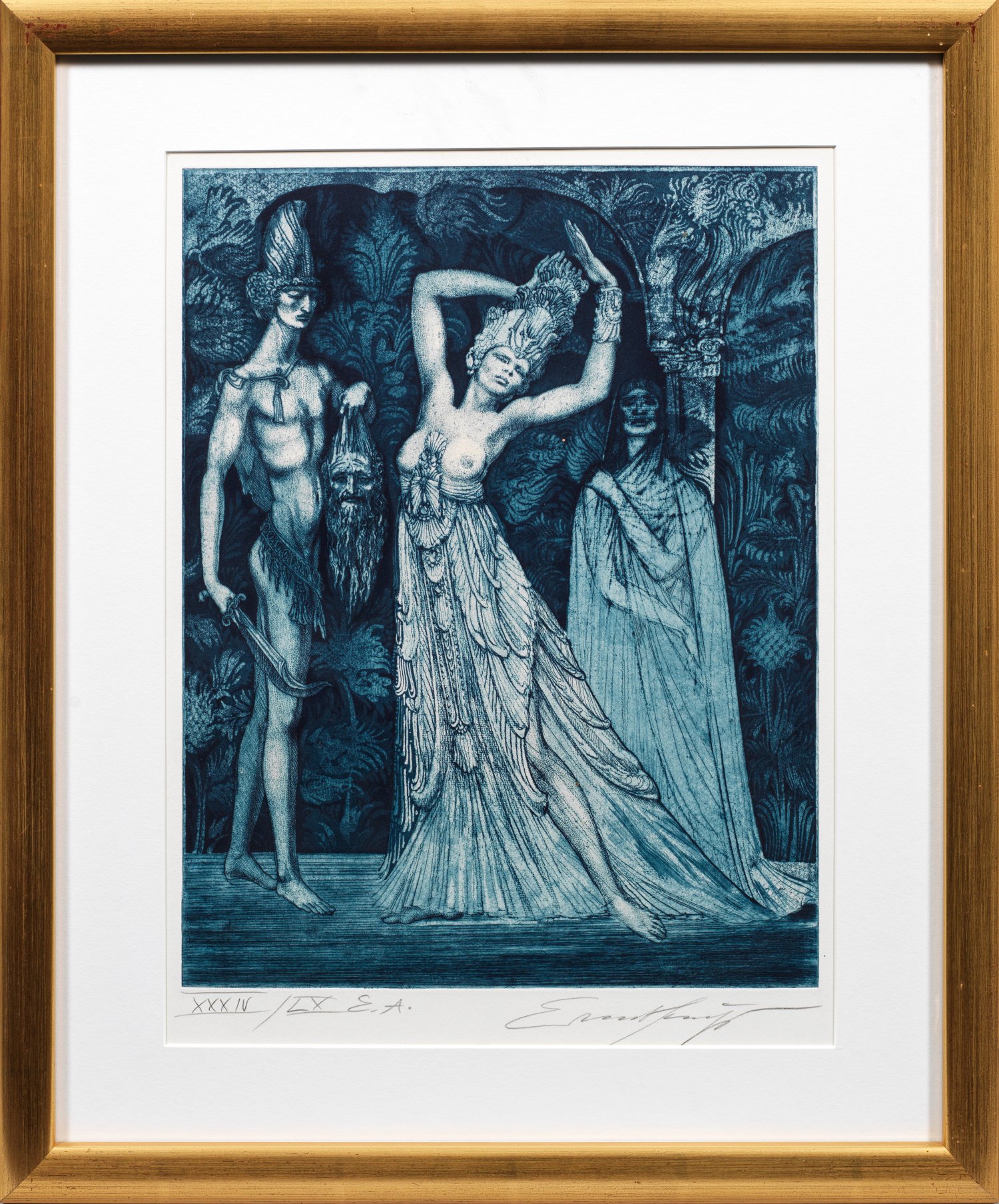 Vernis mou and aquatint in blue on wove paper. Hand-signed and numbered XXXIV/LX E.A.