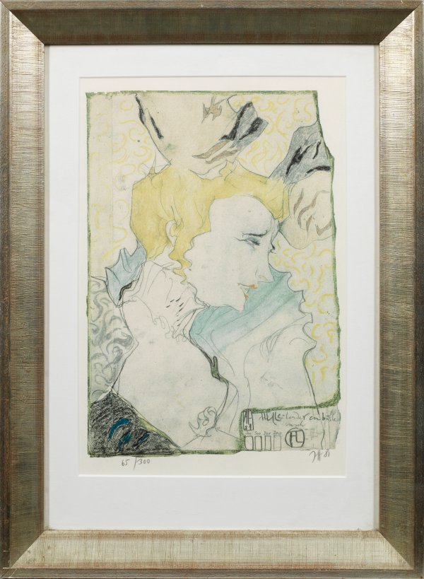 Farbige Fotolithographie (bzw. Farboffset)/Velin, 1981. Sign., dat. u. nummeriert 65/300. Nach der berühmten Lithographie von Henri Toulouse-Lautrec. Dazu ein Blatt Begleittext mit dem faksimilierten, sign. "Huberbrief Nr. 7". Hrsg. Volker Huber, Offenbach. Darstellung ca. 41 cm x 29 cm. Doppelseitig verglaster Rahmen.