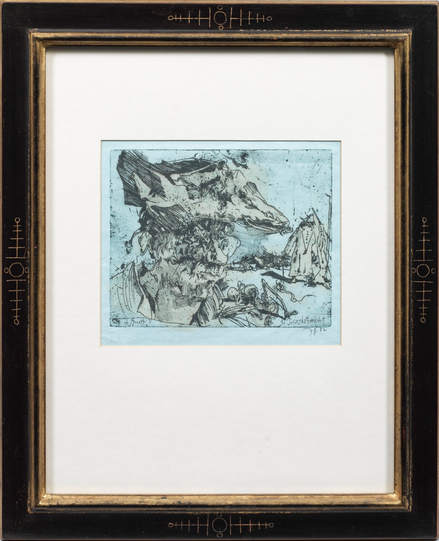 Radierung, in Gelb koloriert/hellblaues Japan, 1986. Sign. und dat. (19)86. In der Platte bez. und betitelt. Aus der gleichnamigen Radierfolge. Wvz. Gäßler 42/16. Plattenmaß 19,6 cm x 24,8 cm. Rahmen.