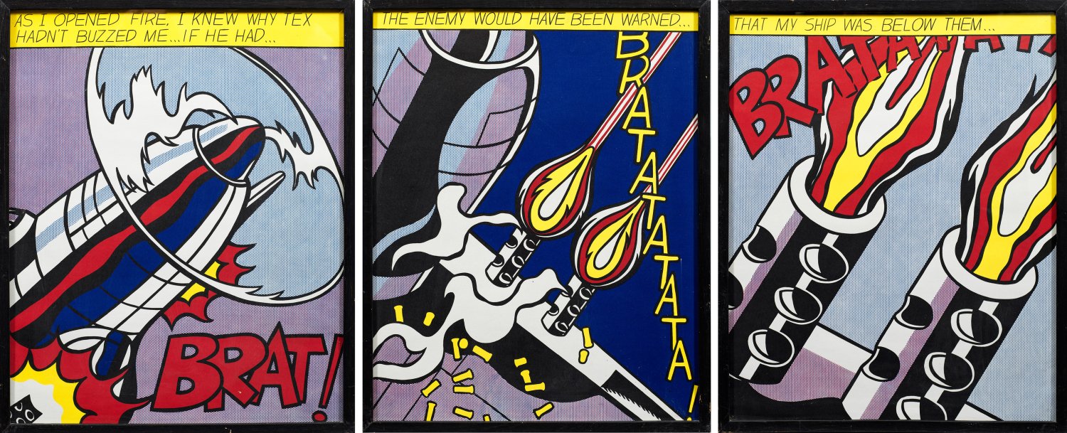 Poster-Triptychon aus drei Farboffsetlithographien/Papier. Hrsg. Stedelijk Museum, Amsterdam. Wvz. Döring/von der Osten 14. Verso jeweils typographisch bez. "edition and color-correction (/) Stedelijk Museum, Amsterdam (/) © R. Lichtenstein 1964 c/o Beeldrecht Amstelveen (/) printed in the nederlands", "ROY LICHTENSTEIN 1923 - 1997 (/) as I opened fire (/) 1964 - acryl on canvas / triptych - panel (...) (/) coll. stedelijk museum amsterdam". Blatt jeweils ca. 61,2 cm x 49,8 cm.