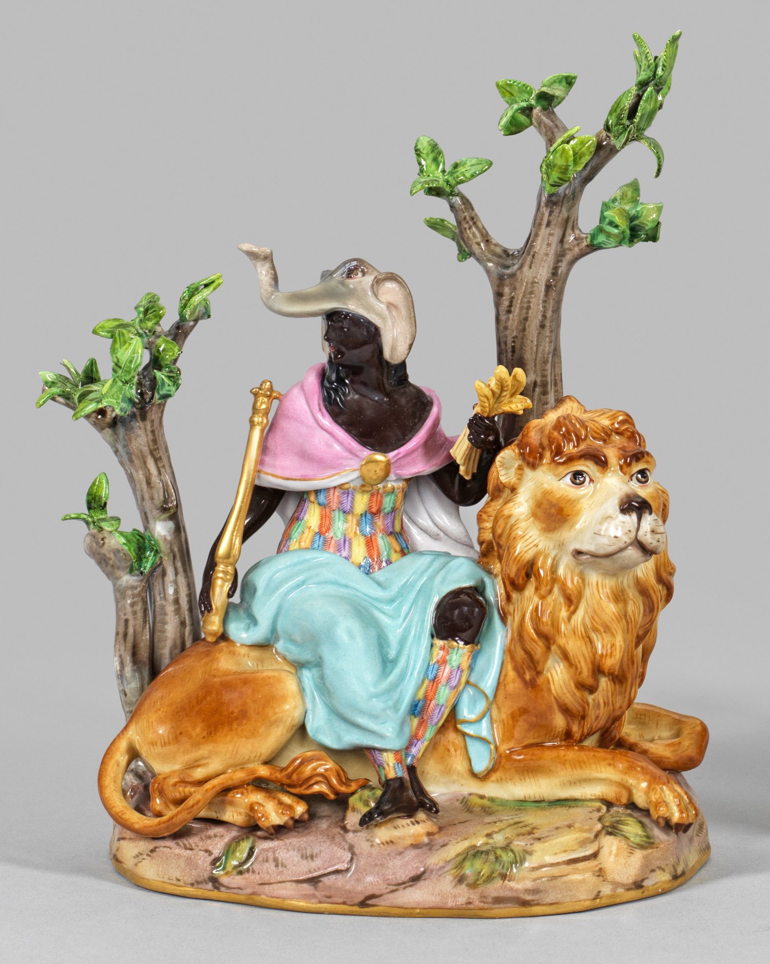 aus der Serie "Vier Erdteile". Auf einem Löwen sitzende Afrikanerin in einem, von Federn geschmückten Gewand mit Elefantenhaube als Personifikation des Kontinents Afrika. Ein Ährenbündel in der linken Hand, ein Zepter in der Rechten haltend. Polychrome Malerei mit Gold. Entw. Johann Joachim Kaendler. Modell-Nr. 763. Rest.; Schwertermarke. H. 20 cm.