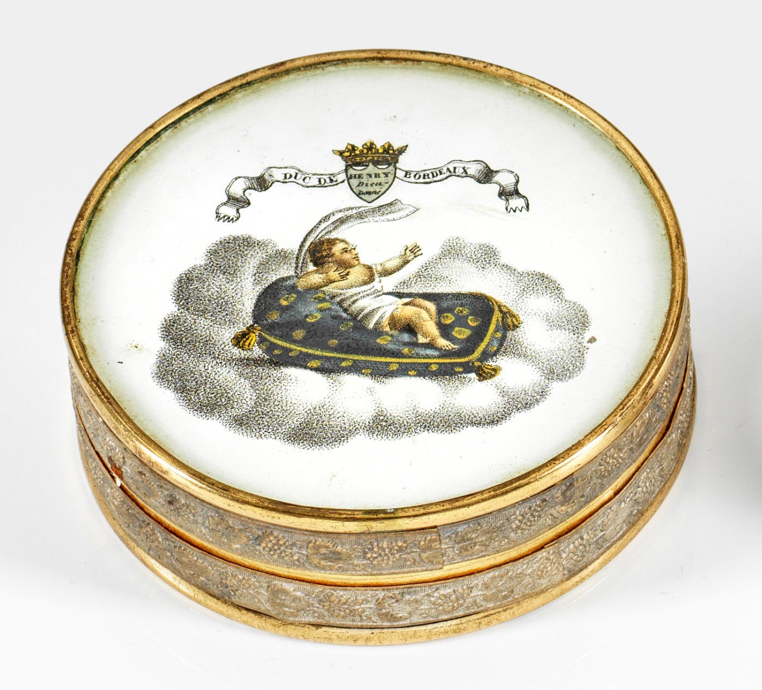 Zylindrischer Korpus. Deckelober- und Bodenunterseite von vergoldetem Metallring gefasst. Im Deckel ein verglaster, teilw. kolorierter Stich in Punktiermanier mit Darstellung eines Kindes auf einem Pouf liegend, getragen von Wolken. Darüber bekröntes Wappenschild mit Banner und Inschrift "HENRY DIEUXDONNÉ DUC DE BORDEAUX". Die Wandung umzogen von geprägtem Zierband mit Weinrebendekor. Rosafarbenes Doseninnere. H. 2 cm. D. 6,8 cm.