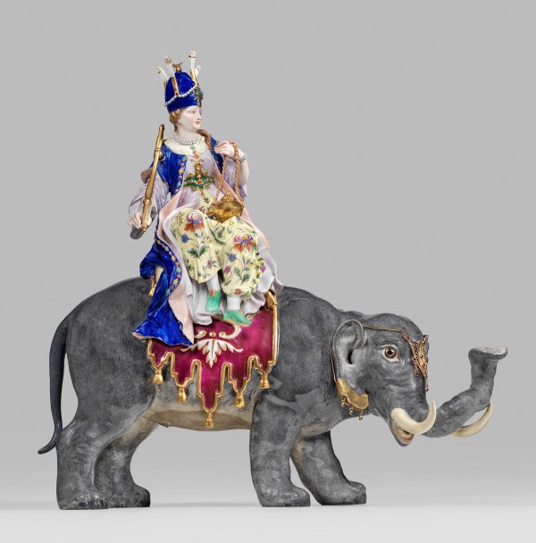 (auch "Perserin auf Elefant"). Stehender, grautonig staffierter Elefant mit erhobenem Rüssel. Auf seinem Rücken über breiter, purpurfarbener Schabracke mit Goldquasten und gelblichen Polsterkissen sitzende Sultanin in orientalischer, mit Edelsteinen besetzter Kleidung und kostbarem Schmuckbehang. Dazu seegrüne Schuhe und eine prächtige Kopfbedeckung. In der rechten Hand ein Zepter, in der Linken eine Räucherampel tragend. Polychrome Malerei mit reicher Goldstaffage. Entw. wohl Johann Joachim Kaendler und Peter Reinicke, Mitte 18. Jh.; Elefant behangen mit filigranem, vergoldetem Kopfschmuck. Rest.; Schwertermarke. H. 43 cm. 44 cm x 19 cm.
