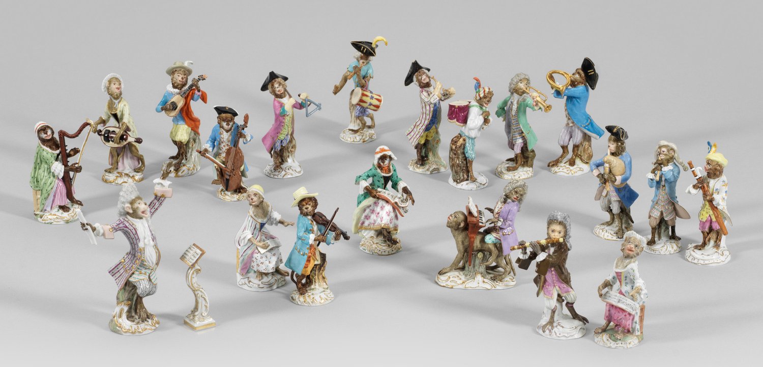 A 21-piece collection of porcelain figures from the "monkey orchestra" modelled by J. J. Kaendler and P. Reinicke. Music desk dated after 1973. Restored. Crossed swords mark.