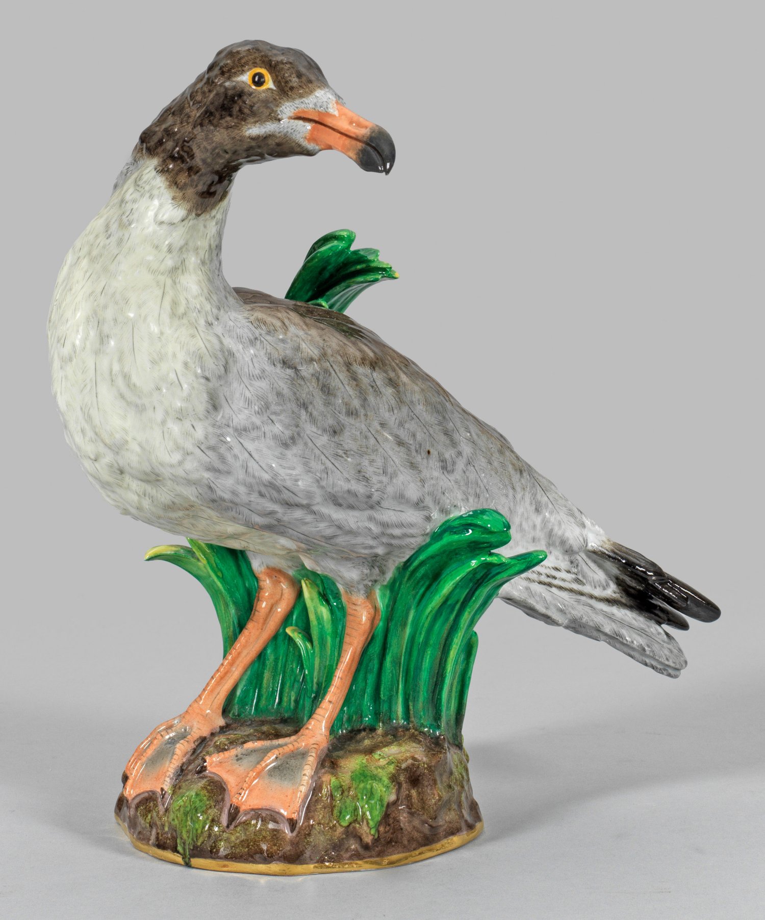 Auf rundem Grassockel zwischen hohem Schilf stehende Möwe, den Kopf nach rechts gewandt. Naturalistisch gestaltetes weiß-graues bis braunes, fein gestricheltes Federkleid. Polychrome Malerei. Entw. Johann Joachim Kaendler. Modell-Nr. 2014. Rest.; Schwertermarke. H. 27 cm.