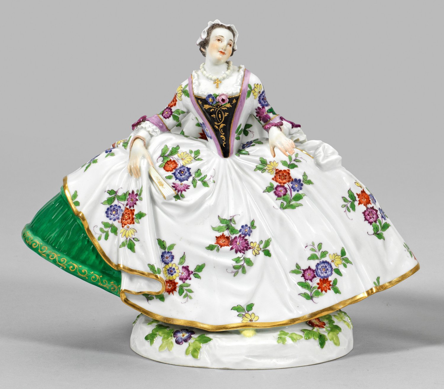 Auf einem blumenbelegten Sockel stehende, junge Dame in weißem, mit Indianischen Blumen gemustertem Kleid über grünfarbenem Krinolinenrock, in ihrer rechten Hand einen Fächer haltend. Polychrome Malerei mit Goldstaffage. Entw. J. J. Kaendler. Modell-Nr. 550 x. Rest.; Schwertermarke. H. 20 cm.