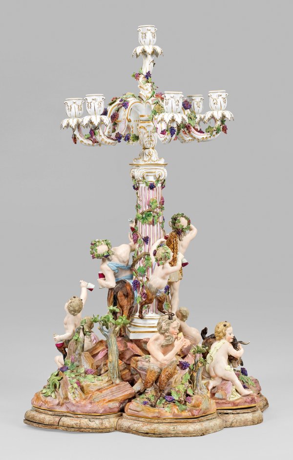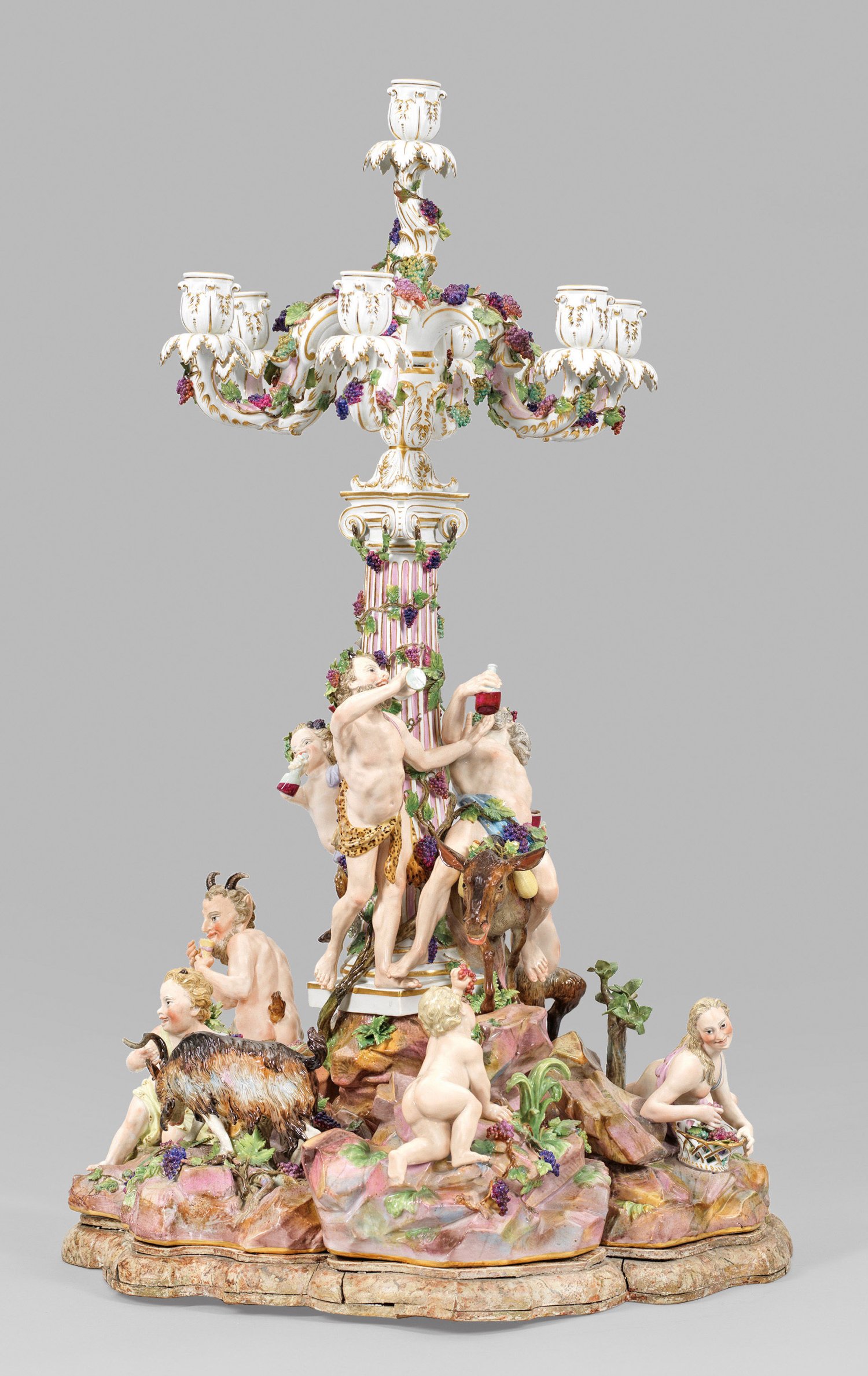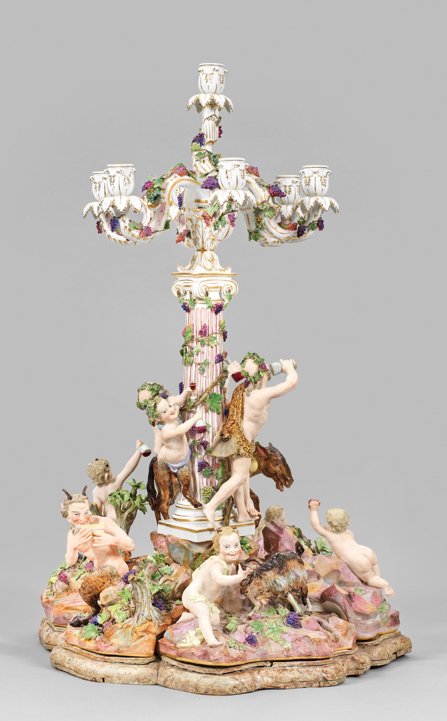 1- bzw. 7-flg.; Sechsteiliges, rundansichtig konzipiertes Ensemble aus vollplastischen Figuren bzw. -gruppen, montiert auf blassfarbig marmoriertem und profiliertem Holzsockel. Umlaufend dynamisch-bewegte, bacchanalische Szene, den ausgelassen feiernden Bacchus und sein trinkfreudiges Gefolge zeigend. Auf reliefplastischem, ansteigendem Felssockel mit aufgelegten Pflanzenbüscheln, kleinen Bäumen sowie Weinreben und -ranken mittig emporragender, ionischer Säulenschaft mit rosafarben staffierter Kannelierung, bekrönt von einer akanthusreliefierten Kerzentülle. Abnehmbarer Leuchteraufsatz aus sieben geschweiften Armen mit vasenförmiger Tülle über blattförmiger Rosette als Wachsfänger. Allseitig belegt von plastischen Weinlaubranken. Schauseitig auf einem Esel erhöht sitzender, trunkender Silen mit Weinflasche und -pokal, umgeben von dem weinbekränzten Bacchus mit Leopardenfell, sich ein Tringefäß zum Mund führend bzw. einem Satyrknaben mit menschlichem Oberkörper und Bocksbeinen. Unterhalb liegende Bacchantin mit einem traubengefüllten Korb. Zu ihren Seiten ein Putto, einen Bund Trauben emporhaltend bzw. ein weiterer Satyrknabe, jeweils eine Weinflasche in der Hand tragend. Rückseitig zwischen üppigem Blattwerk und Weinreben hockendes, gehörntes Satyrkind, einen sich wehrenden Ziegenbock an den Hörnern packend. Zu seiner Rechten stehender, die Flöte spielender Pan. Polychrome Malerei mit Goldstaffage. Entw. Johann Joachim Kaendler, um 1766. Modell-Nr. A 196. Unw. rest.; Schwertermarke. Meissen. 2. Hälfte 19. Jh.; H. 56 cm bzw. 75 cm.