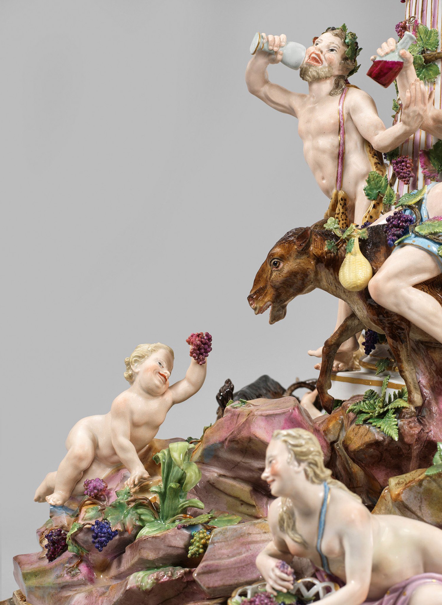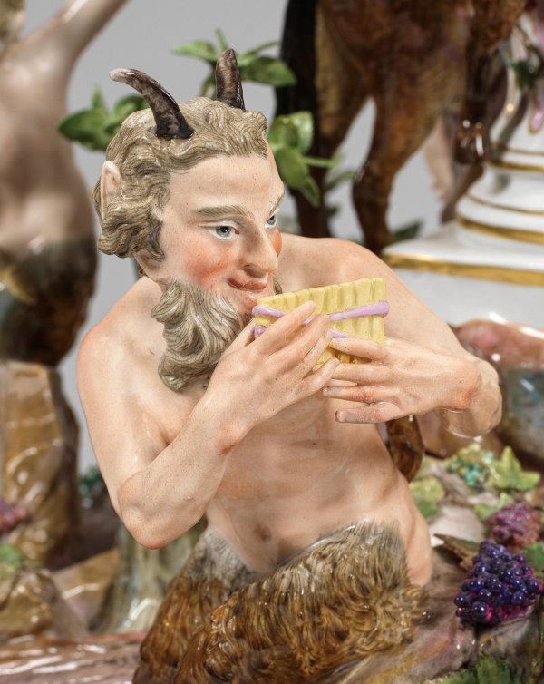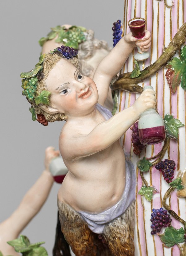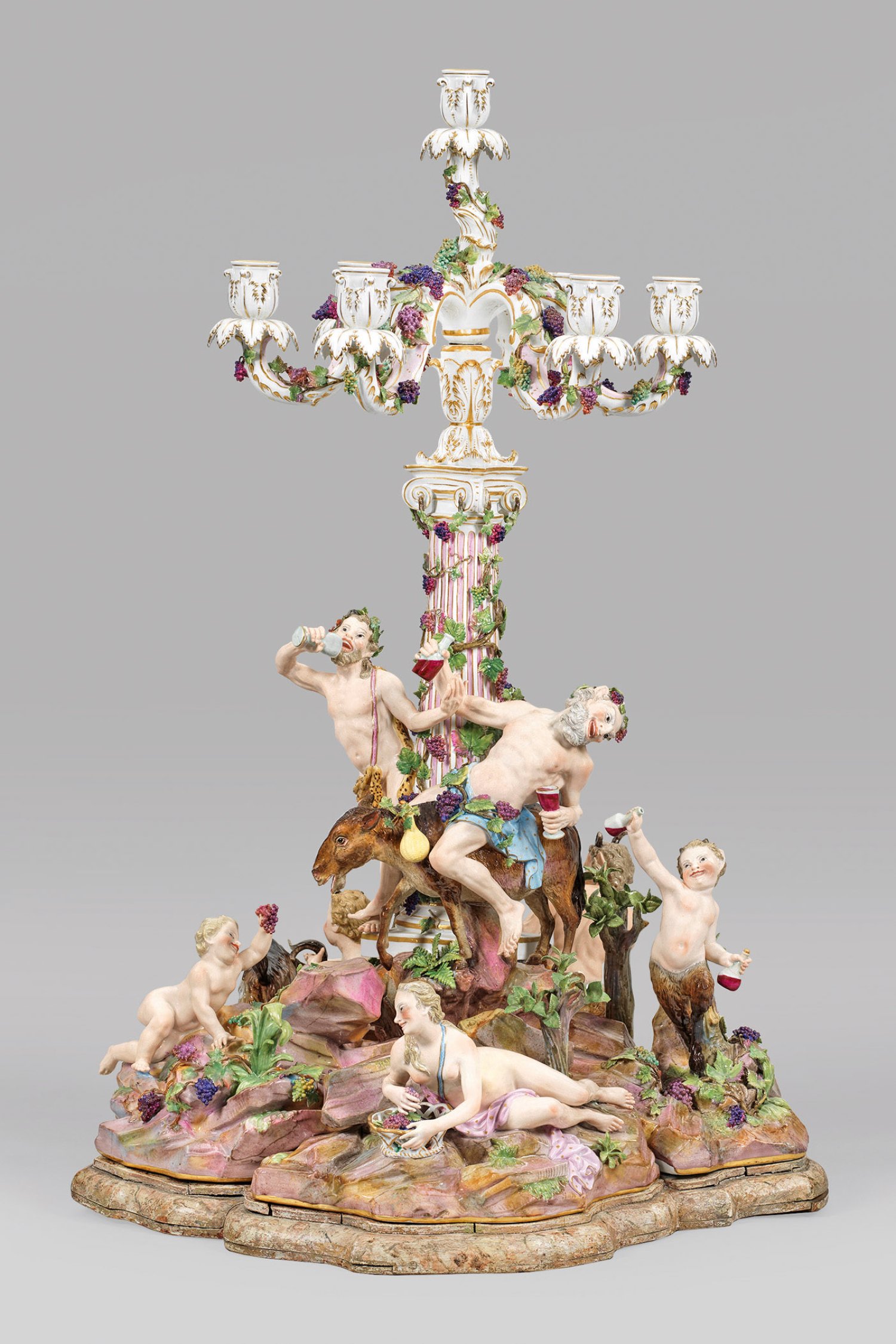 1- bzw. 7-flg.; Sechsteiliges, rundansichtig konzipiertes Ensemble aus vollplastischen Figuren bzw. -gruppen, montiert auf blassfarbig marmoriertem und profiliertem Holzsockel. Umlaufend dynamisch-bewegte, bacchanalische Szene, den ausgelassen feiernden Bacchus und sein trinkfreudiges Gefolge zeigend. Auf reliefplastischem, ansteigendem Felssockel mit aufgelegten Pflanzenbüscheln, kleinen Bäumen sowie Weinreben und -ranken mittig emporragender, ionischer Säulenschaft mit rosafarben staffierter Kannelierung, bekrönt von einer akanthusreliefierten Kerzentülle. Abnehmbarer Leuchteraufsatz aus sieben geschweiften Armen mit vasenförmiger Tülle über blattförmiger Rosette als Wachsfänger. Allseitig belegt von plastischen Weinlaubranken. Schauseitig auf einem Esel erhöht sitzender, trunkender Silen mit Weinflasche und -pokal, umgeben von dem weinbekränzten Bacchus mit Leopardenfell, sich ein Tringefäß zum Mund führend bzw. einem Satyrknaben mit menschlichem Oberkörper und Bocksbeinen. Unterhalb liegende Bacchantin mit einem traubengefüllten Korb. Zu ihren Seiten ein Putto, einen Bund Trauben emporhaltend bzw. ein weiterer Satyrknabe, jeweils eine Weinflasche in der Hand tragend. Rückseitig zwischen üppigem Blattwerk und Weinreben hockendes, gehörntes Satyrkind, einen sich wehrenden Ziegenbock an den Hörnern packend. Zu seiner Rechten stehender, die Flöte spielender Pan. Polychrome Malerei mit Goldstaffage. Entw. Johann Joachim Kaendler, um 1766. Modell-Nr. A 196. Unw. rest.; Schwertermarke. Meissen. 2. Hälfte 19. Jh.; H. 56 cm bzw. 75 cm.