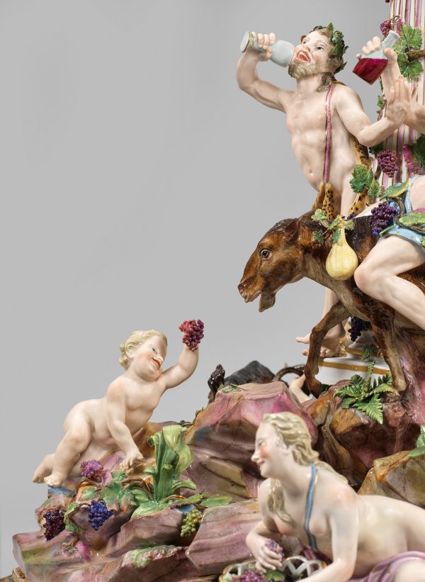 Ähnliche mehrteilige Gruppen, beispielsweise der Tafelaufsatz „Parnass mit Apoll und den neun Musen“, wurden oft in Verbindung mit umfangreichen Servicen bestellt. Die Darstellung von Bacchus und seinem Gefolge war ein ausgesprochen beliebtes Thema in der Meissener Porzellanplastik des 18. Jhs. und wurde mit Bacchus als Einzelfigur oder als Gruppe mit Silen, Satyrknaben oder Bacchantinnen ausgeformt. Die vorliegende zentrale Bacchus-Silengruppe in Kombination mit einem ionischen Säulenschaft führte Kaendler bereits bei einer Aufsatzschale aus dem 1761 von Friedrich dem Großen bestellten und nach königlichen Vorgaben gefertigten, sog. "Möllendorf-Service" mit eisenrotem Schuppenrand aus.