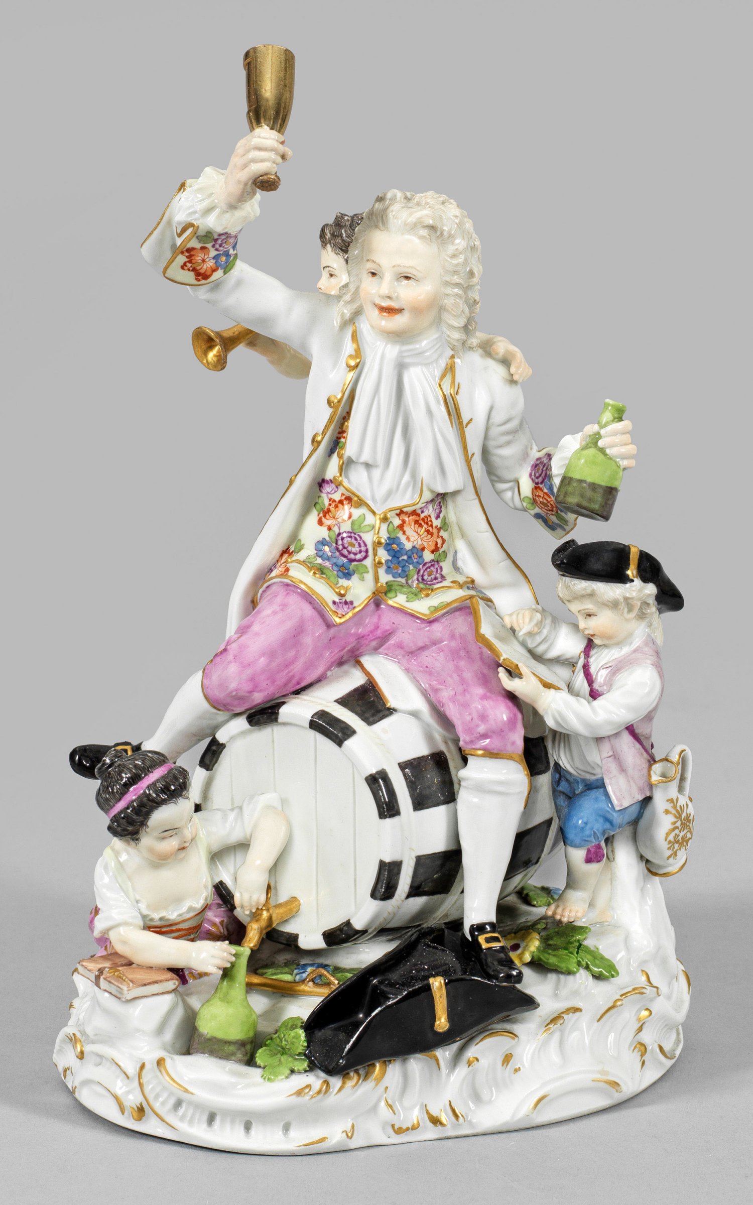 Reliefierter, mit plastischen Blüten und Blättern belegter Rocaillesockel. Auf einem liegenden Weinfass sitzender Herr mit Allongeperücke in eleganter Rokoko-Kleidung aus purpurfarbener Kniebundhose und weißem Rock über Hemd und zartgelber, mit Indianischen Blumen gemusterter Weste. In der erhobenen, rechten Hand sowie in der Linken jeweils eine Flasche haltend. Unterhalb liegender, schwarzer Hut. Hinter ihm ein Satyrkind mit Trompete. Flankierend ein Knabe mit Feder und Buch sowie Weinkanne und ein am Boden sitzendes Mädchen beim Abfüllen des Weines aus dem Fass. Polychrome Malerei mit Goldstaffage. Entw. Johann Carl Schönheit, 1770. Unw. best.; Schwertermarke. H. 22,5 cm.