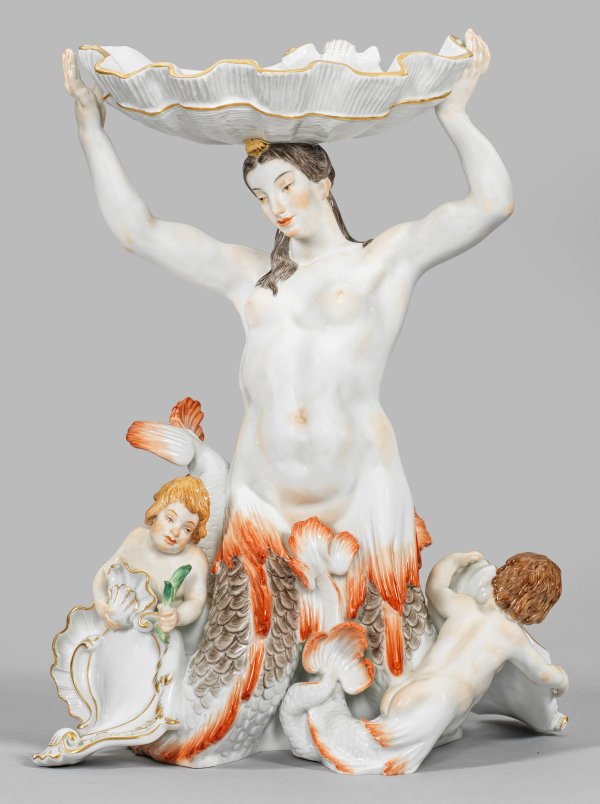 Auf ihren fischschwänzigen Beinen kniende, vollplastisch gearbeitete, goldbekrönte Meeresnymphe mit leicht gedrehtem Oberkörper, in ihren erhobenen Armen eine gerippte Muschelschale haltend. Flankierend je ein Tritonkind mit großem, rocailleförmigem Kartuschenschild, ursprünglich als Träger für das Allianzwappen von Heinrich Graf von Brühl und seiner Gemahlin Franziska von Kolowrat-Krakowsky. Polychrome Malerei mit dominierendem Eisenrot und Braun. Goldstaffage.
