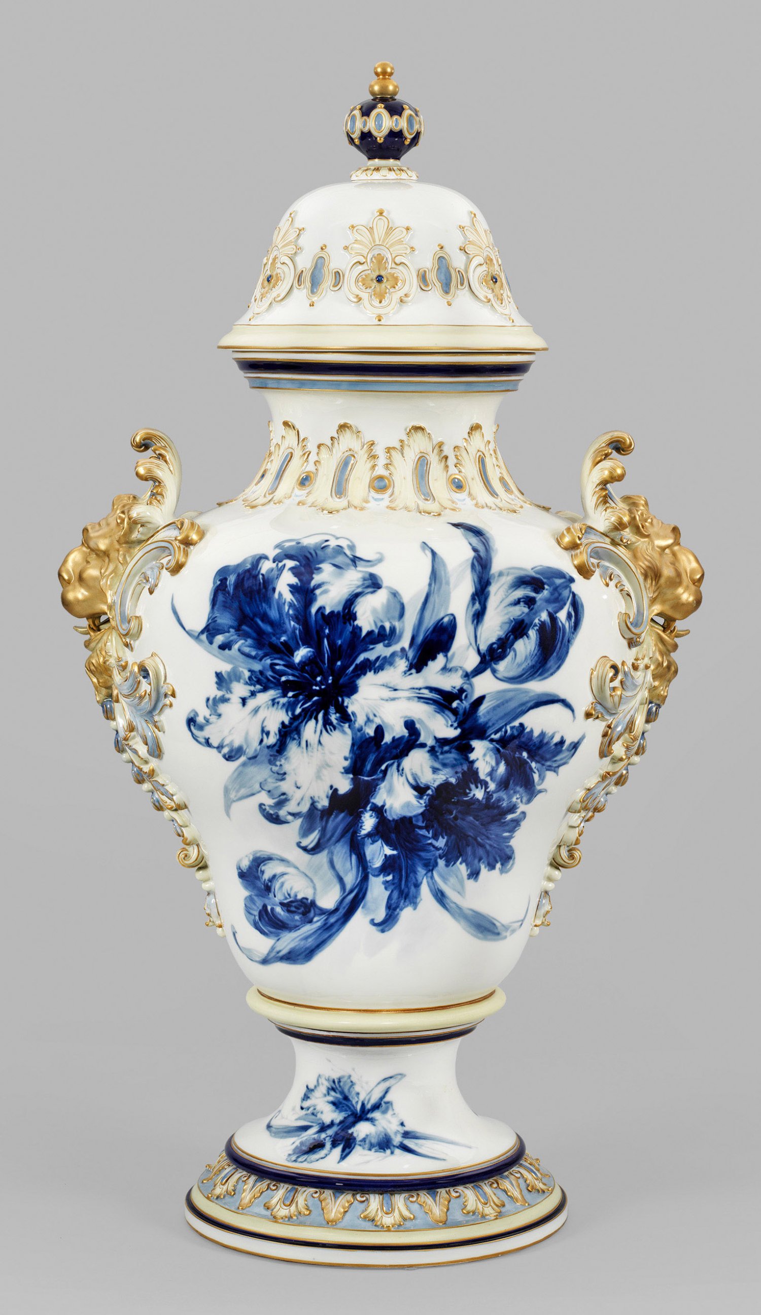 Über hochgezogenem, mehrfach gegliedertem Rundfuß balusterförmiger Korpus mit gerundeter Schulter, in gekehlten Hals und ausschwingenden Rand übergehend. Haubenförmig aufgewölbter Deckel mit dreifachem Kugelknauf. Seitliche Handhaben als imposante, stark plastisch aufgelegte, vergoldete Löwenmaskaronköpfe, umzogen von üppigem Blattrocaillewerk. Zartgelbe und bläulich akzentuierte Staffierung, teilw. mit Fondbändern. Beidseitig der Wandung großflächig angelegter "Deutsche Blume"-Dekor mit Arrangements aus blühenden Tulpen bzw. Pfingstrosen in mehrtoniger, unterglasurblauer Malerei "en camaieu". Korrespondierender Blumendekor auf dem Sockel. Umlaufende Reliefornamentbordüren aus Akanthusblattwerk und Medaillons. Reiche Goldstaffage matt und poliert. Entw. nach Meissener Modell, wohl von J. J. Kaendler, um 1757 - 1760. Neuausformung in der KPM Berlin um 1850. Verzeichnetes Modell-Nr. 4133. In Schwarz bez. "8760". Zepter- und Malereimarke. H. 101 cm.