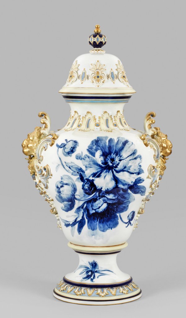 Imposantes Vasenmodell im Stil des französischen Barocks um 1700, welches ursprünglich von Friedrich II. von Preußen um 1757 in der Manufaktur Meissen nach eigenen Vorstellungen in zwei Varianten in Auftrag gegeben worden war, genauer "1 weiß mit Löwen Köpffen und stark vergoldet" und "1 mit blauen teutschen Bluhmen gemahlt (und teilweise vergoldet)". Um 1760 wurden diese um zwei weitere Exemplare ergänzt. Sie waren zur Aufstellung im Freien im Schloss Sanssouci bestimmt, wobei die Vasen mit Löwenköpfen bis ins 20. Jh. hinein auf der obersten Terrasse des friderizianischen Schlosses und jene mit Blumen vor der Bildergalerie im Schlosspark standen. Im Jahre 1850 wurde die KPM Berlin beauftragt, dieses Vasenmodell nach Meissener Vorbild in gleicher Größe auszuformen. Ein nahezu identisches Modell mit geringfüg abweichender Farbstaffage befindet sich im Dolmabahce Palace in Istanbul.