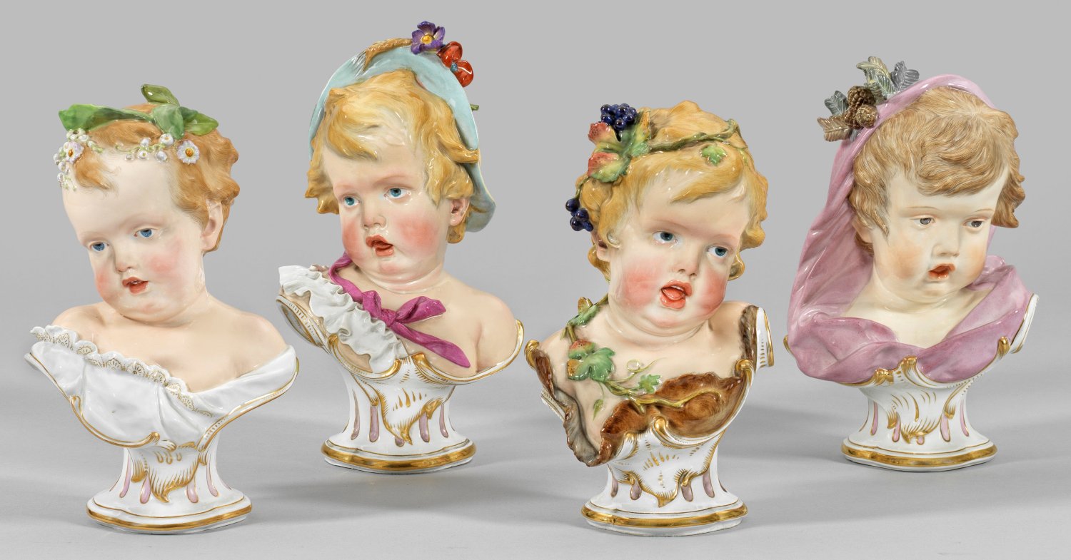 A complete series of four porcelain busts of a child as allegory of the seasons. Partly firing crack. Crossed swords mark.