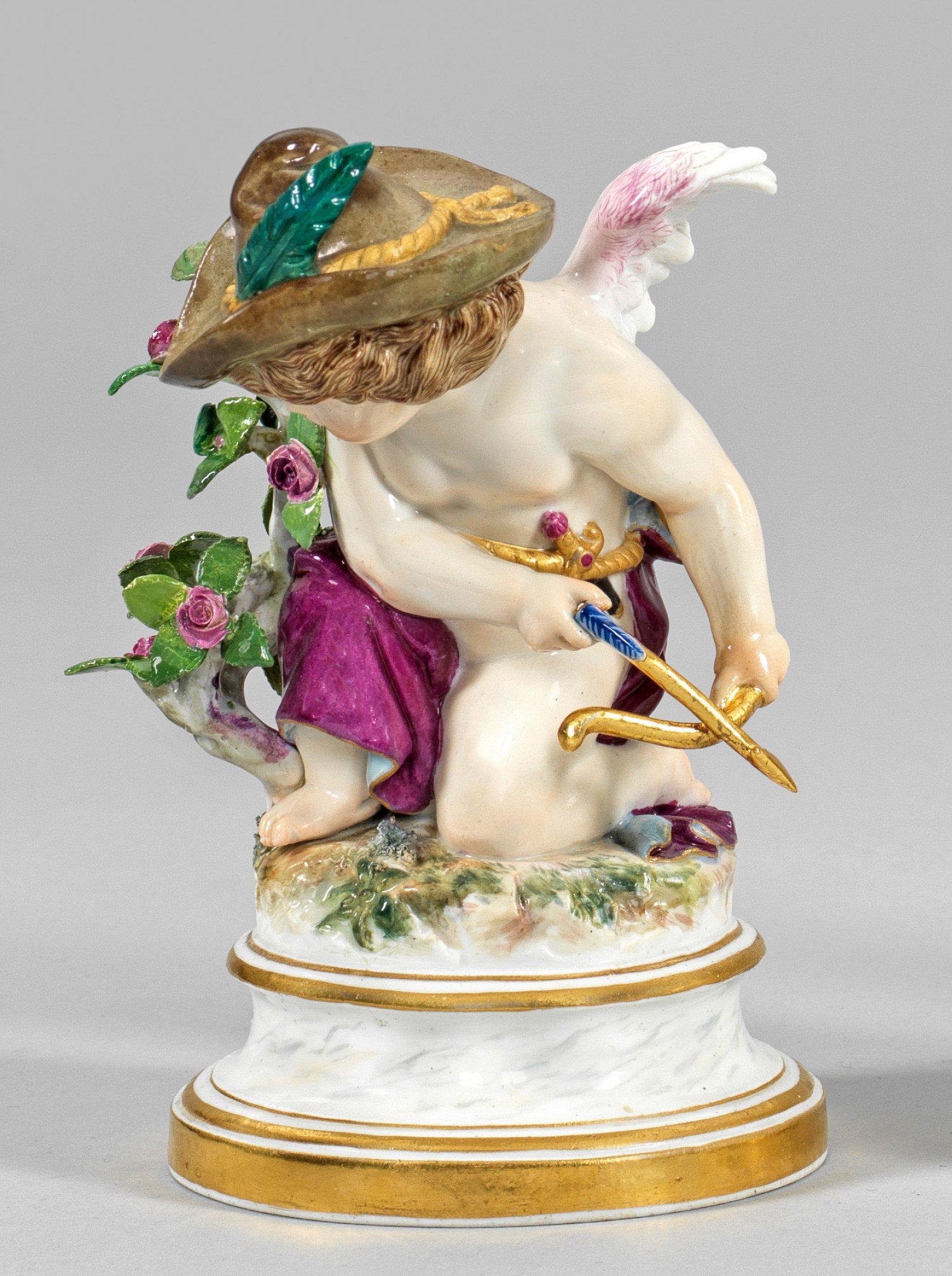 Auf profiliertem, marmoriertem Rundsockel hockender, hinter einem Rosenstrauch lauernder Amor mit federgeschmücktem Hut, in den Händen Pfeil und Bogen haltend. Polychrome Malerei mit Goldstaffage. Entw. Heinrich Schwabe. Modell-Nr. L 106. Rest.; Schwertermarke. H. 15,5 cm.