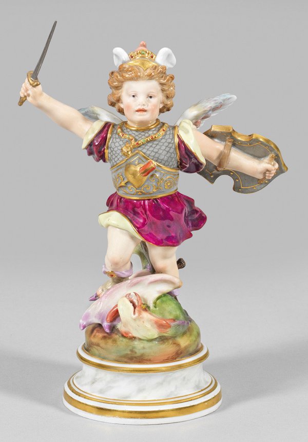 Auf profiliertem, marmoriertem Rundsockel, triumphierend auf dem Leib eines Drachens stehender Amor als Heldengestalt (Drachentöter), ausgestattet mit Harnisch und Flügelhelm, Krone sowie mit Schwert und Schild. Polychrome Malerei mit teilw. radierter Goldstaffage. Entw. Heinrich Schwabe. Modell-Nr. L 113. Unw. rest.; Schwertermarke. H. 25 cm.