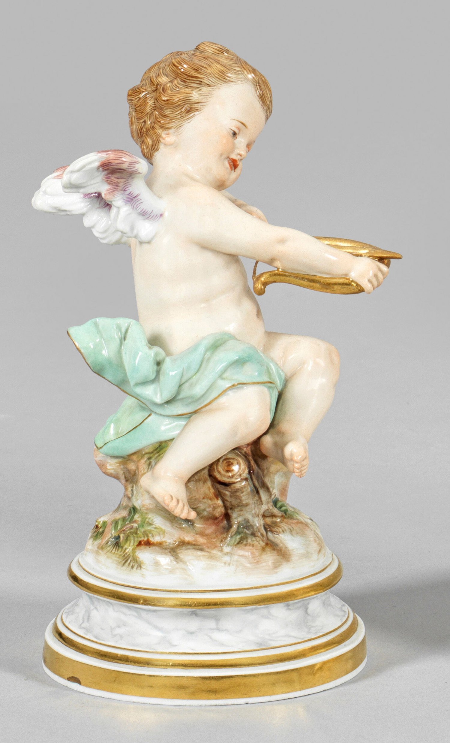 Profilierter, marmorierter Rundsockel. Auf einem Fels sitzender Amor, einen Pfeil abschießend. Polychrome Malerei mit Goldstaffage. Entw. Heinrich Schwabe. Modell-Nr. L 104. Unw. rest.; Schwertermarke. H. 17 cm.