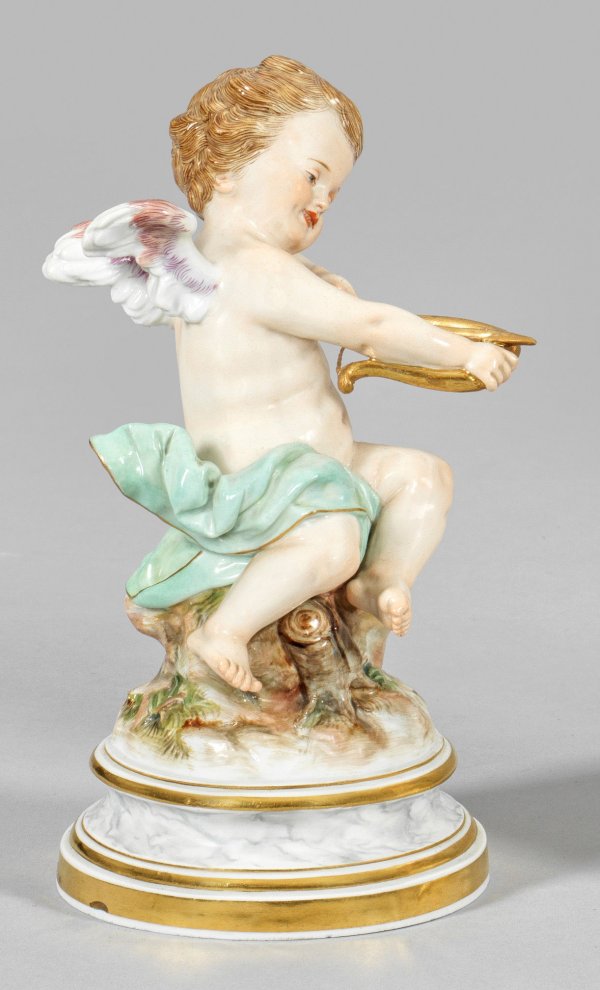 A rare porcelain figure of a cupid firing an arrow. Insignificantly restored. Crossed swords mark.