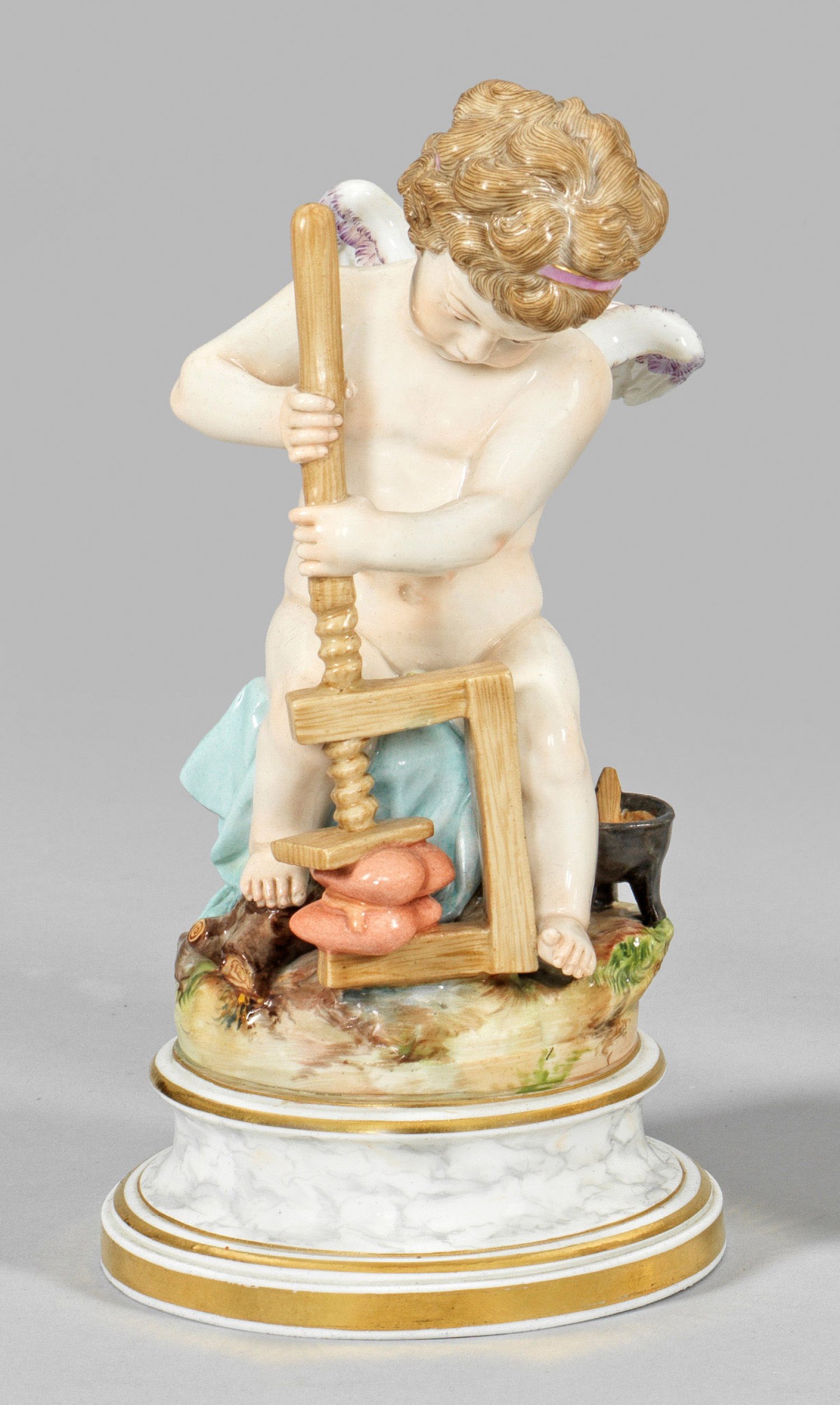 Auf profiliertem, marmoriertem Rundsockel sitzender Amor, zwei Herzen mit einer Schraubzwinge zusammenpressend. Entw. Heinrich Schwabe. Modell-Nr. L 107. Unw. rest.; Schwertermarke. H. 18,5 cm.