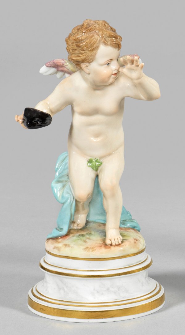 Auf profiliertem, marmoriertem Rundsockel stehender Amor mit einer Maske, sich mit der linken Hand zum Spott an die Nase fassend. Polychrome Malerei mit Goldstaffage. Entw. Heinrich Schwabe. Modell-Nr. L 110. Schwertermarke. H. 19 cm.