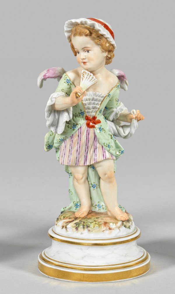 Auf profiliertem, marmoriertem Rundsockel, über naturalistisch gestaltetem Terrain stehende, kokett posierende Amorette in blauem, blumig gemustertem, höfischem Kleid über gestreiftem Unterkleid mit spitzenbesetzter Haube, in ihrer rechten Hand einen blumenverzierten Fächer haltend. Polychrome Malerei mit Goldstaffage. Entw. Heinrich Schwabe. Modell-Nr. L 111. Schwertermarke. H. 22 cm.