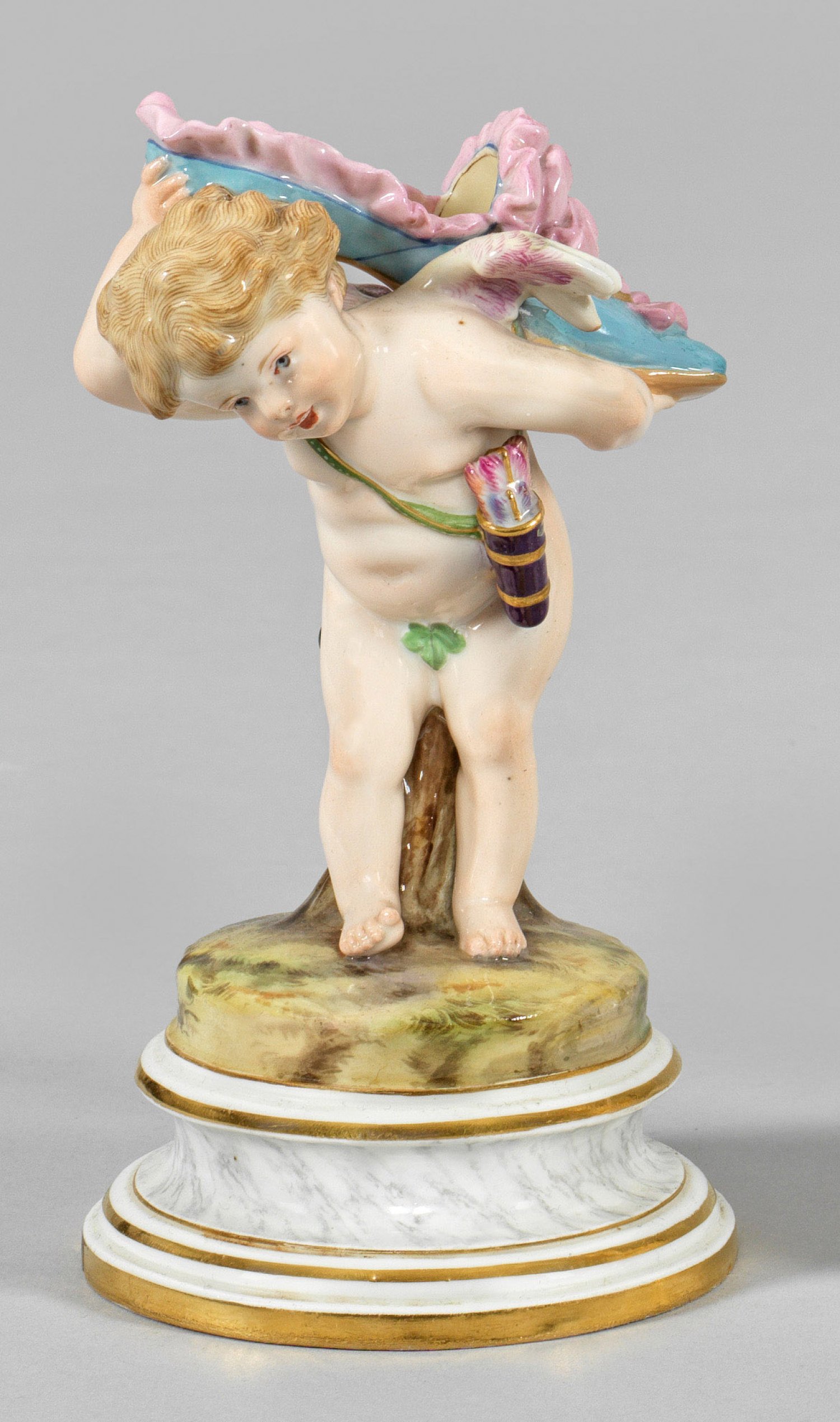 Auf profiliertem, marmoriertem Rundsockel gebückt stehender Amor, einen großen Pantoffel mit Rüschenbesatz auf dem Rücken tragend. Polychrome Malerei mit Goldstaffage. Entw. Heinrich Schwabe. Modell-Nr. L 117. Schwertermarke. H. 16 cm.