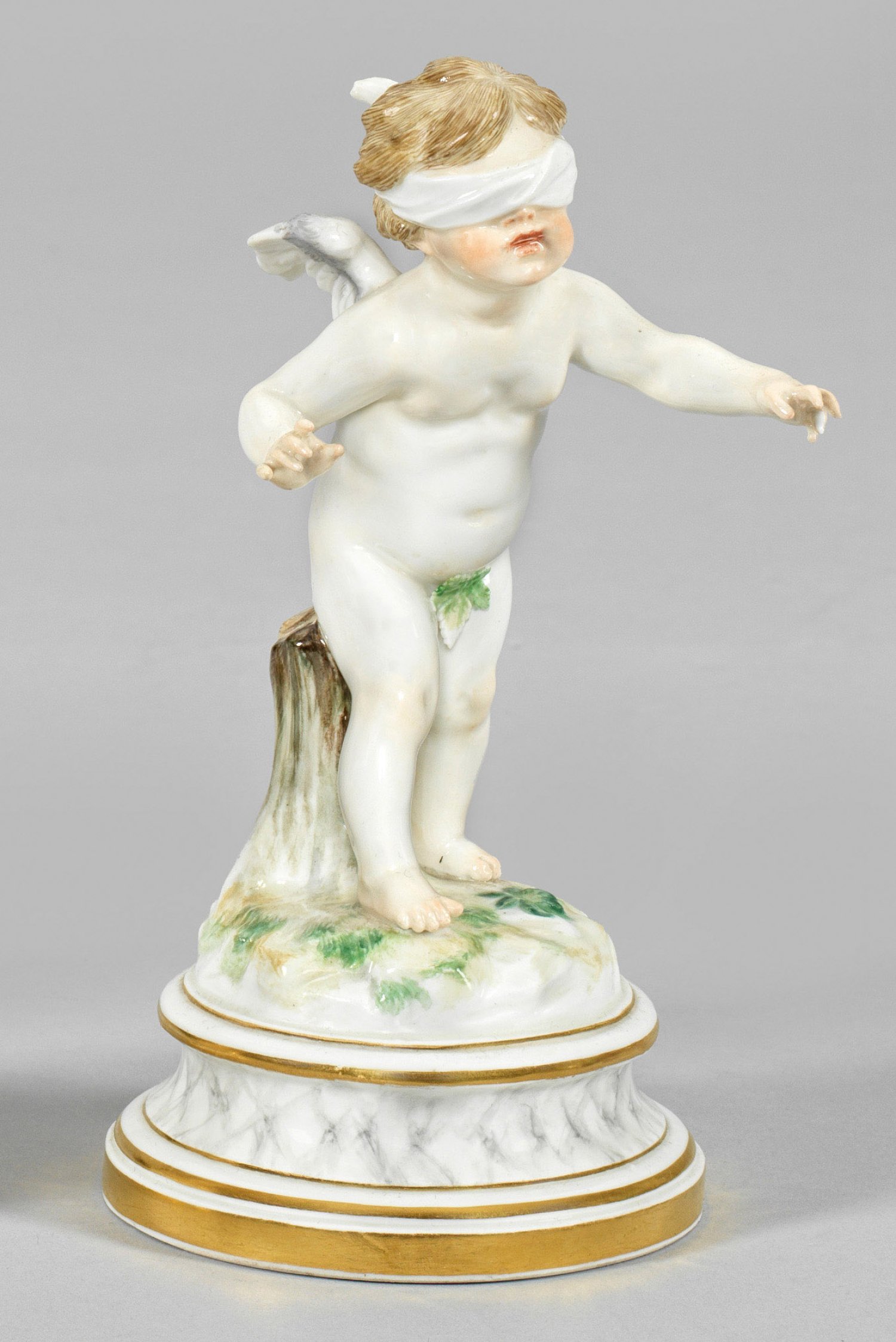 Auf profiliertem, marmoriertem Rundsockel stehender Amor mit verbundenen Augen beim "Blinde-Kuh"-Spiel. Polychrome Malerei mit Goldstaffage. Entw. Heinrich Schwabe. Modell-Nr. L 119. Minim. best.; Schwertermarke. H. 18 cm.