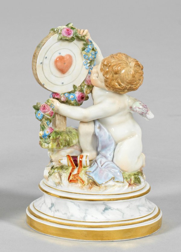 Auf profiliertem, marmoriertem Rundsockel kniender, siegreicher Amor, eine Herz-Zielscheibe mit einer Blumengirlande schmückend. Polychrome Malerei mit Goldstaffage. Entw. Heinrich Schwabe. Modell-Nr. L 123. Minim. best.; Schwertermarke. H. 15,5 cm.
