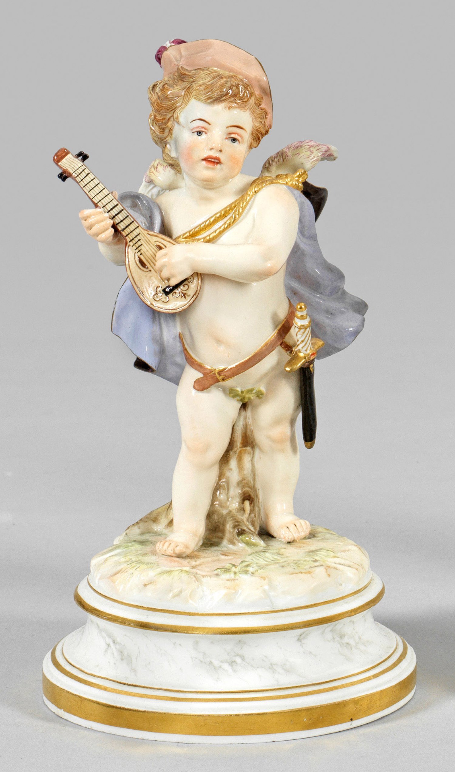 Auf profiliertem, marmorierten Rundsockel mit naturalistischem Terrain stehender Amor mit Federkappe und Umhang, die Laute spielend. Polychrome Malerei mit Goldstaffage. Entw. Heinrich Schwabe. Modell-Nr. L 124. Unw. rest.; Schwertermarke. H. 19,5 cm.