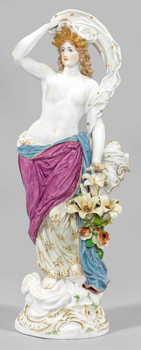 Gehöhter, reliefplastischer Rocaillesockel. Auf einer Wolkenbank stehende, antikisierende, junge Frau in Gestalt der Aurora, die Göttin der Morgenröte, Botin des Tages und Siegerin über die Nacht. Das lange, wellige, fein gezeichnete Haar ist von einem strahlenförmigen Diadem bekrönt und bedeckt mit einem weißen, von Goldsternen gemusterten Schleier. Zu ihrer Seite emporwachsende, plastisch gearbeitete Lilien und Rosen sowie Ährenbündel. Polychrome Malerei mit reicher, teilw. radierter Goldstaffage. Entw. Emmerich Andresen, 1893. Modell-Nr. P 105. Rest.; Schwertermarke. H. 41 cm.