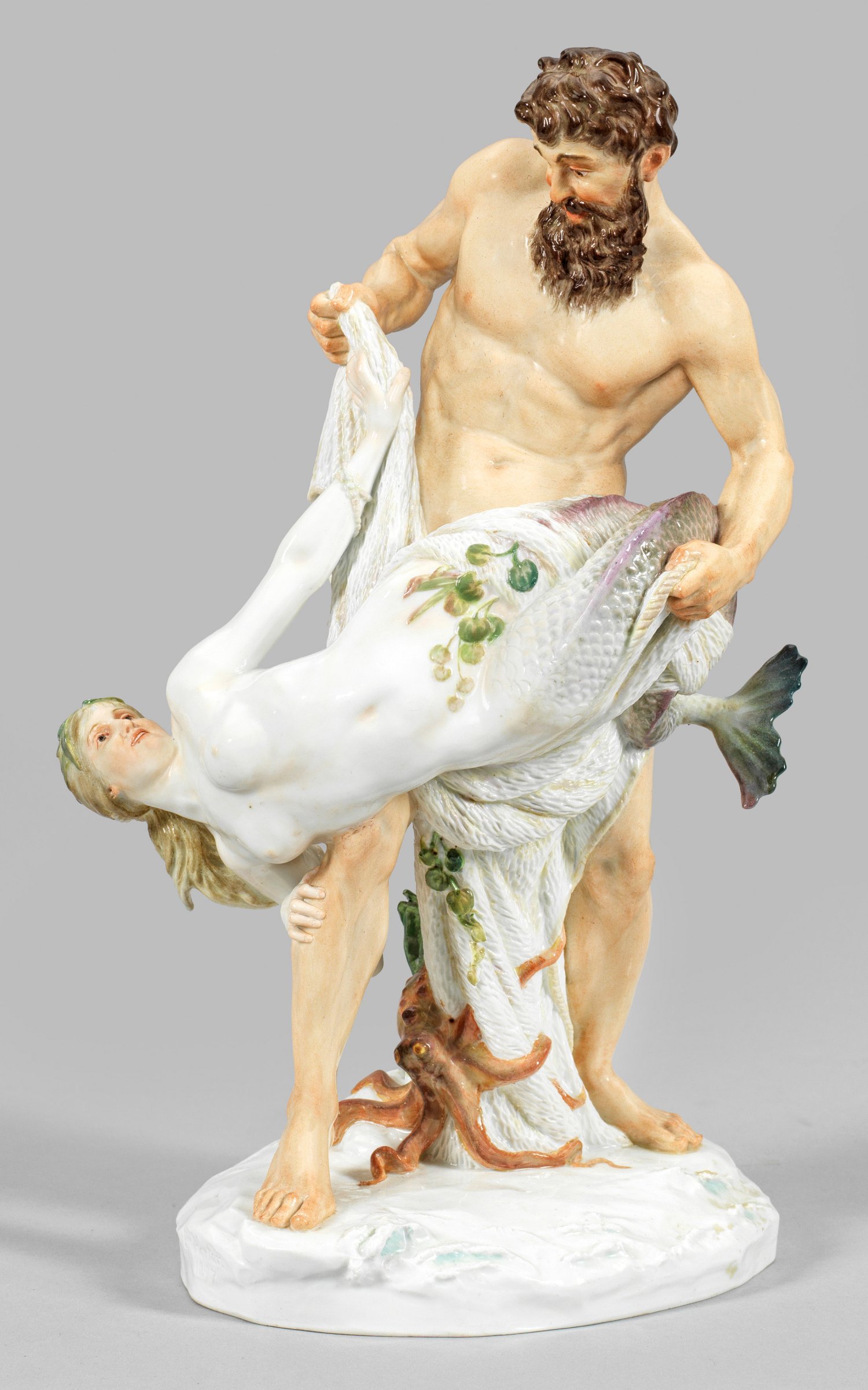 A porcelain figure group of a fisherman and mermaid, titled "Mermaid capture". Insignificantly restored. Crossed swords mark.