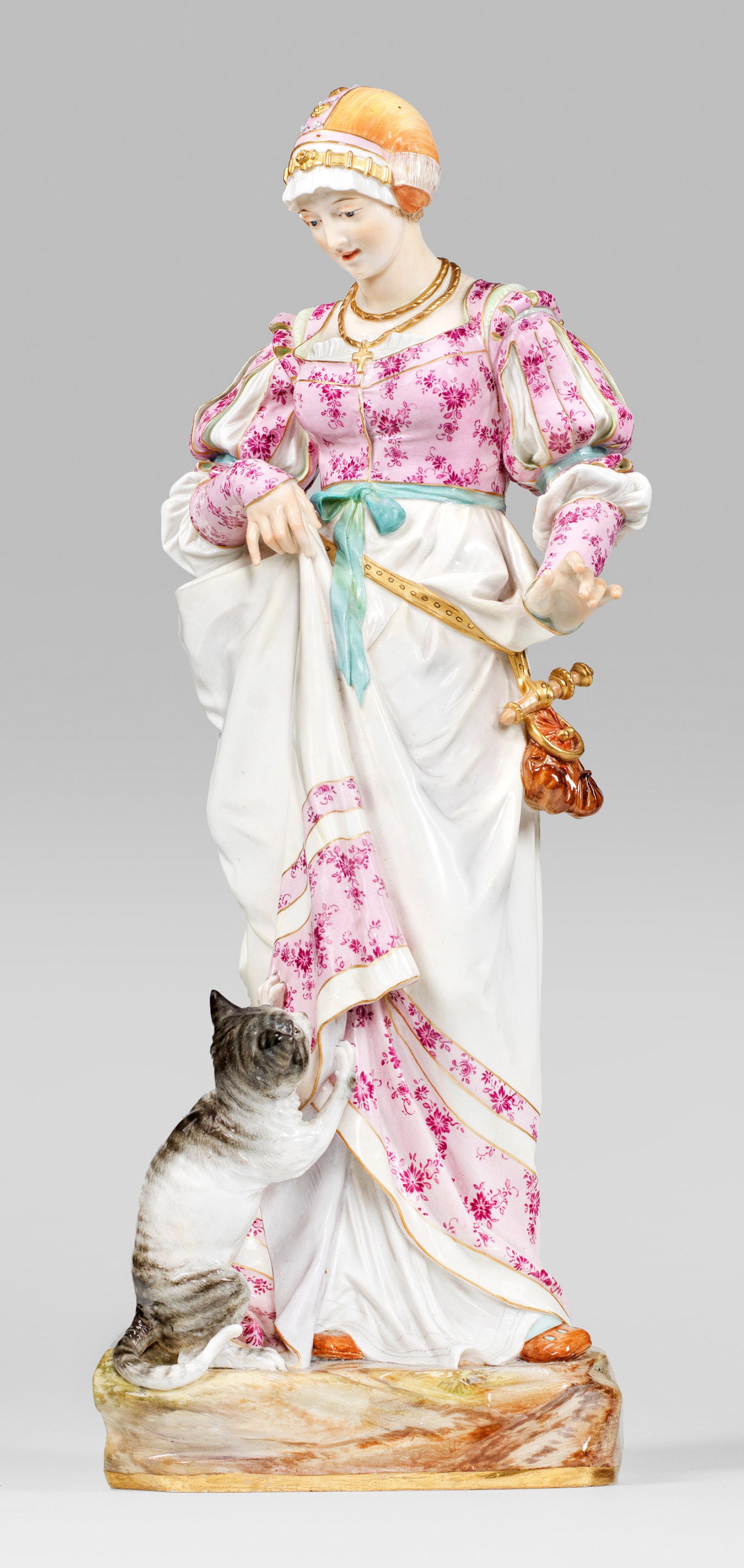 Auf naturalistisch gestaltetem Sockel stehende junge, zu Boden blickende Edeldame in mittelalterlich anmutendem, blumig gemustertem, beige abgesetztem Kleid mit seitlich gegürteter Tasche. Als Kopfbedeckung eine prächtige, edelsteinbesetzte Haube. Mit der rechten Hand hebt sie ihr Kleid, an dem sich eine am Boden sitzende Katze festgekrallt hat. Polychrome Malerei mit teilw. radierter Goldstaffage. Entw. Heinrich Goeschl, 1882. Modell-Nr. M 190. Unw. rest.; Schwertermarke. H. 40 cm.