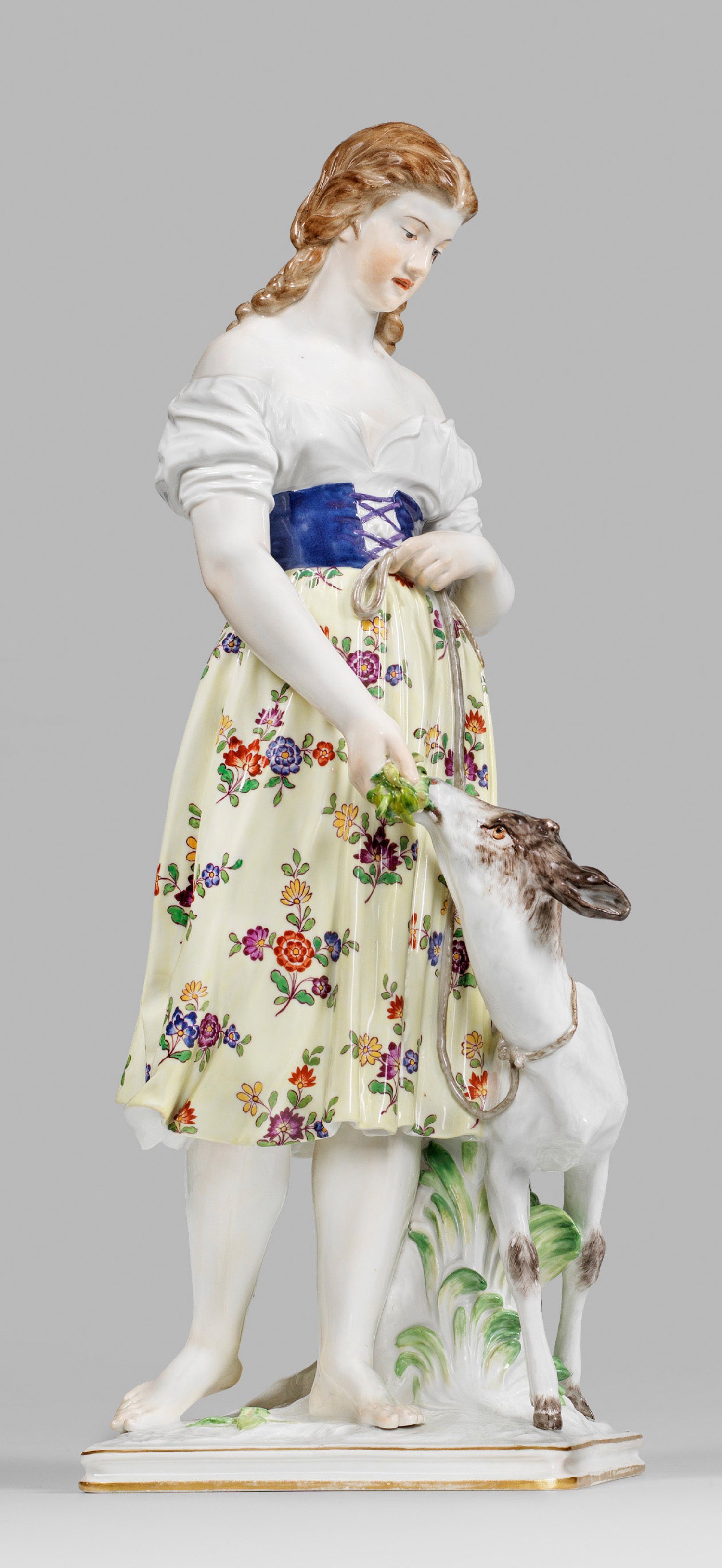 Auf rechteckiger, gekehlter und goldkonturierter Plinthe stehendes Mädchen in ländlicher Kleidung aus einem, zartgelben Rock mit Indianischem Blumenmuster, weißer Bluse und blauem Mieder. Das lange hellbraune Haar ist seitlich in lockeren Zöpfen geflochten. Sie senkt ihren Blick zu einem Reh, das verwunschene Brüderchen, das sie fürsorglich füttert. Polychrome Malerei. Entw. Johann Christian Hirt, 1881. Nach einer Märchenfigur der Brüder Grimm. Entw.-Bez. "J. Hirt". Modell-Nr. M 163. Unw. rest.; Schwertermarke. H. 48 cm.